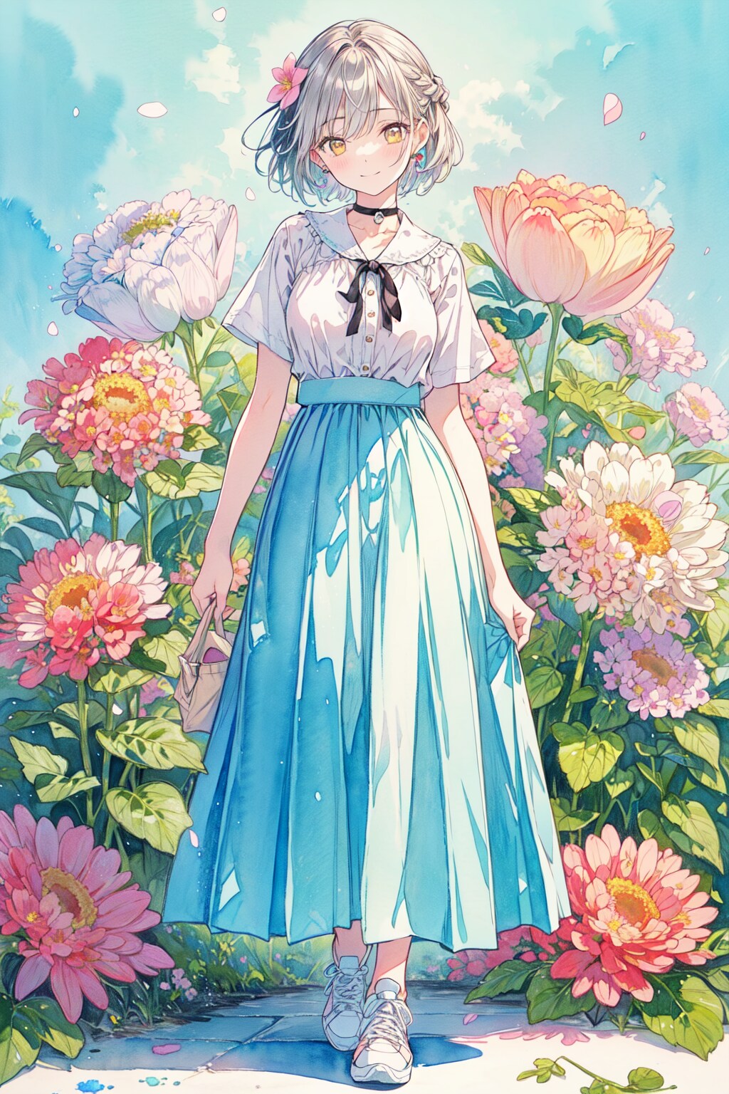 ⑨(blouse:1.4), (long skirt:1.6), short sleeves, (sneakers:1.2), choker,