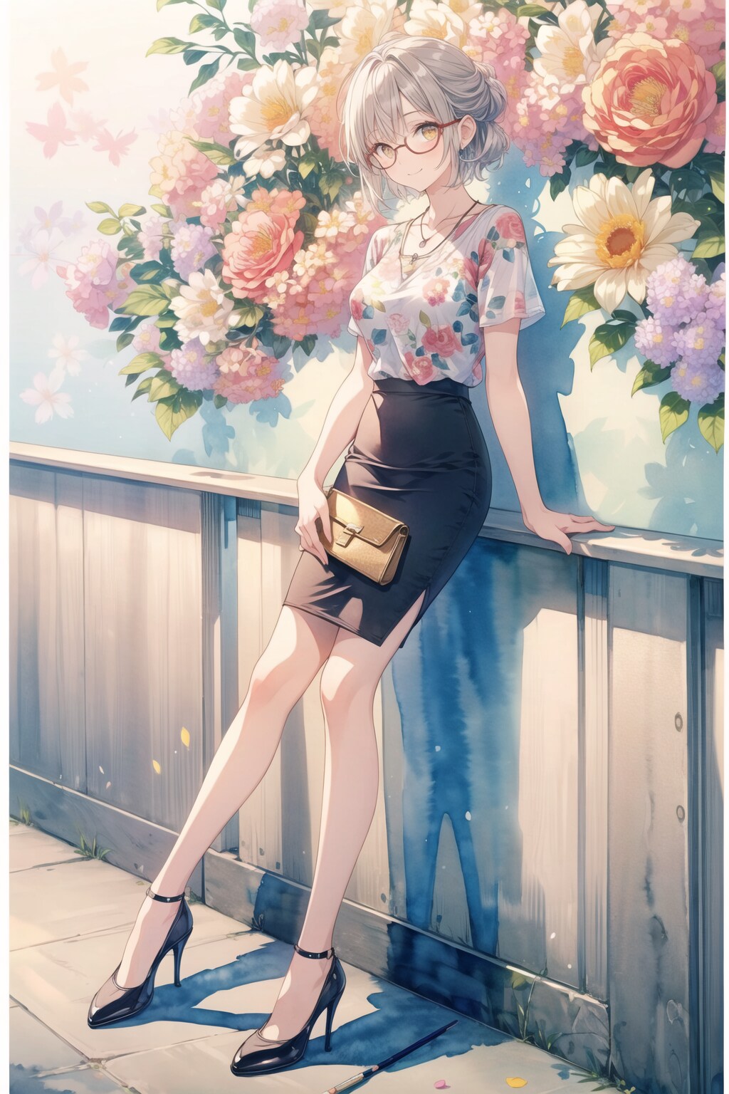 ⑪(see-through blouse:1.1), (pencil skirt:1.3), short sleeves, (high heels:1.2), necklace, glasses, handbag,