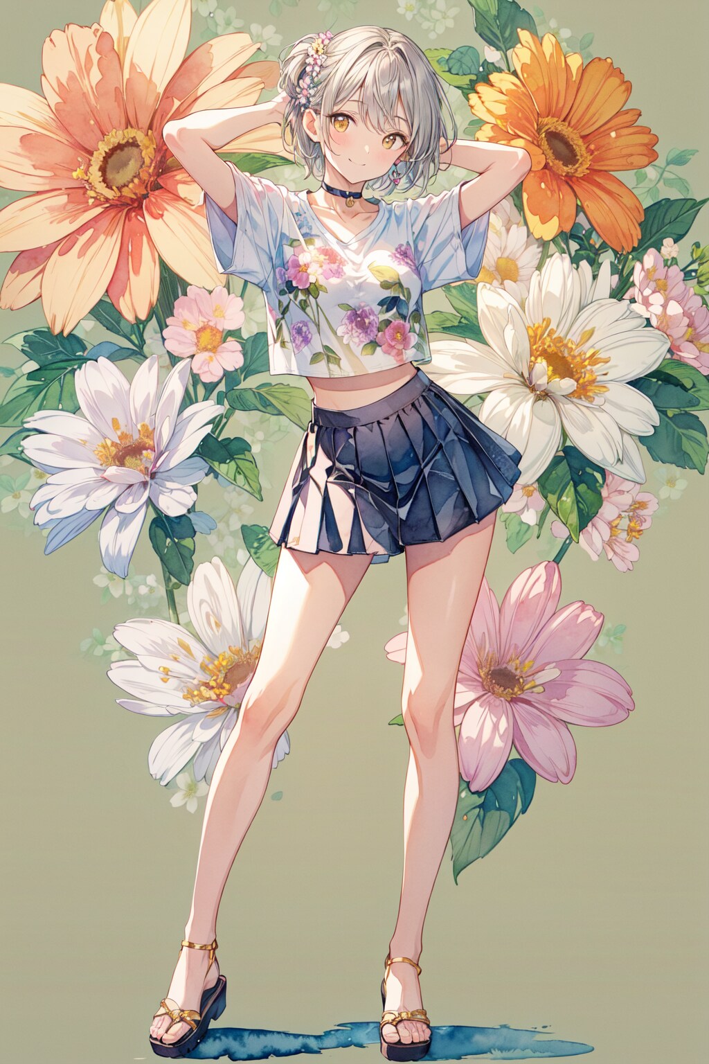 ⑩(cropped shirt:1.8), (pleats skirt:1.2), short sleeves, (sandal:1.2), choker, sunglasses,