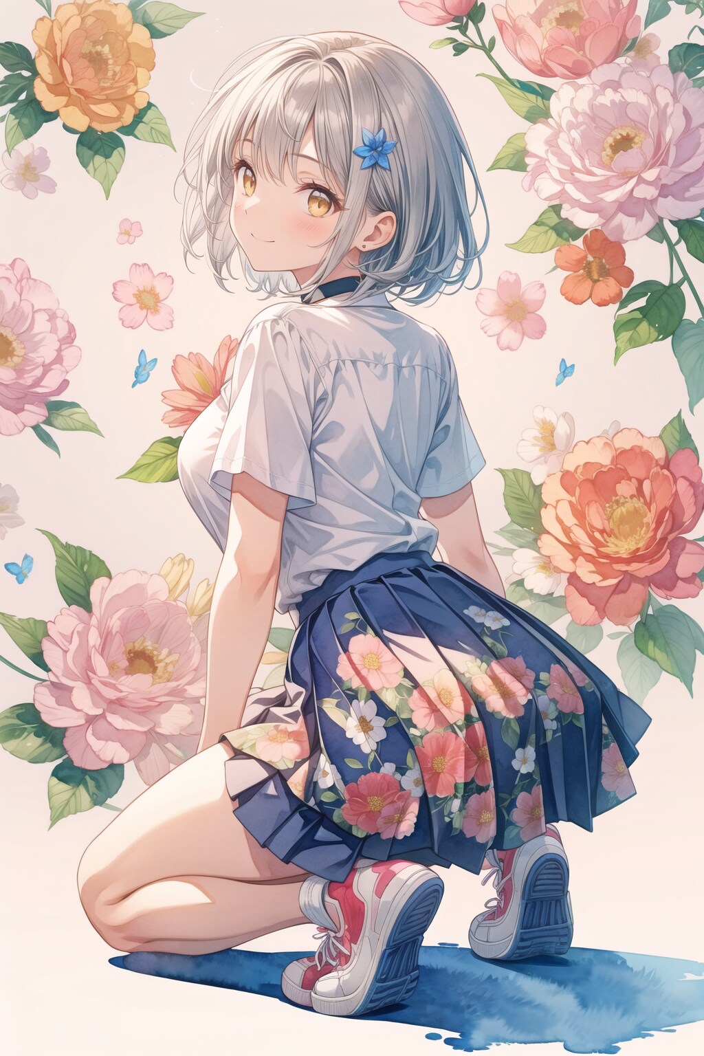 ⑫button shirt, collared shirt, (pleats skirt:1.2), short sleeves, (sneakers:1.2), choker,
