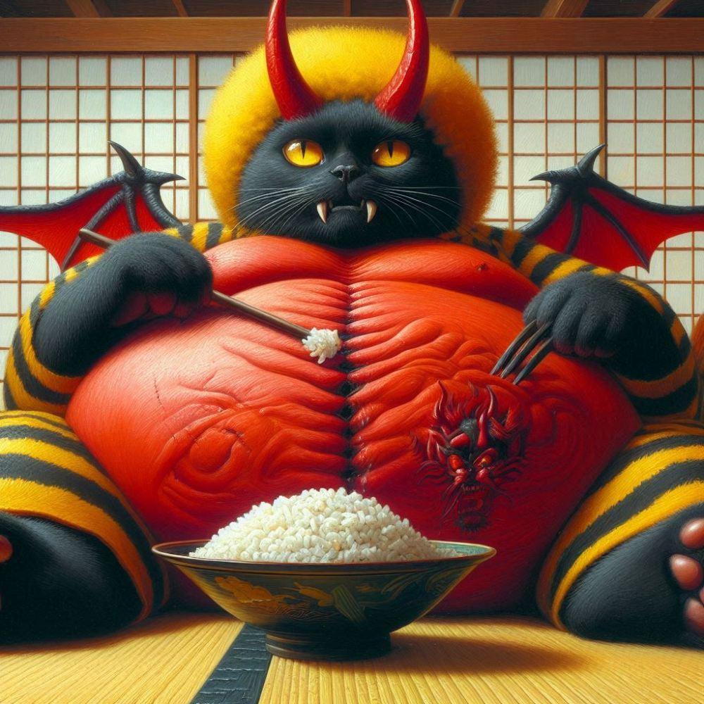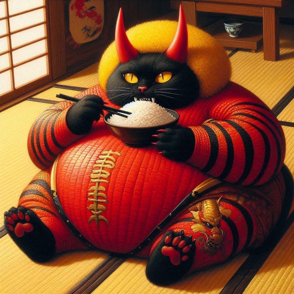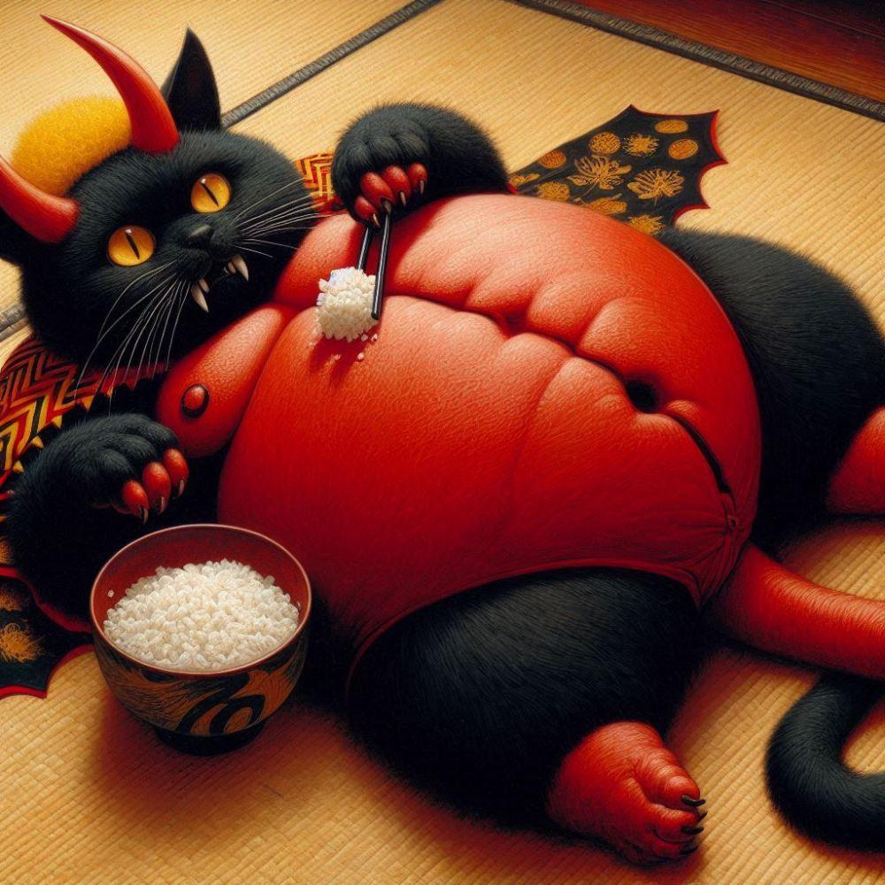 油絵ファンタジー、節分後、ご飯を食べて畳の床に横になって寝る鬼のコスプレ猫のお腹