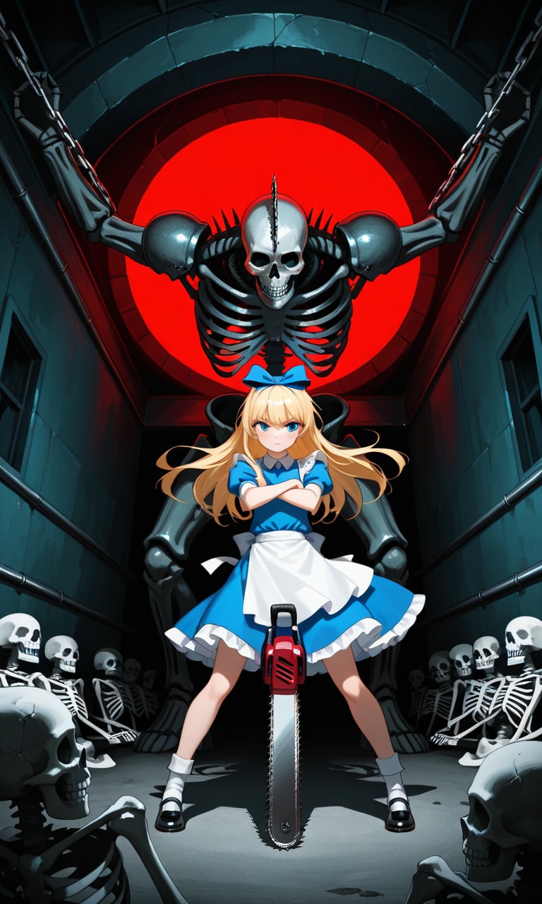 「地下道で、チェンソーを手に、スケルトンと戦うアリス」と指定して生成したものです