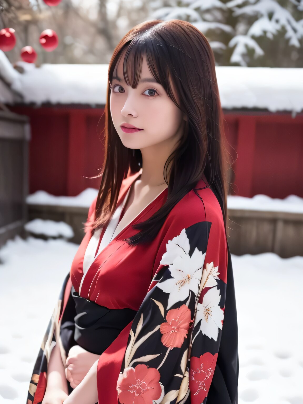 中庭の静けさの中、雪の白さと着物の赤が織り成すコントラストが美しく、彼女の佇まいはまるで絵画のよう。凛とした空気の中で、自然と伝統が織りなす神秘的な空間に溶け込む彼女の姿は、見る者に日本の美と心を改めて感じさせる。