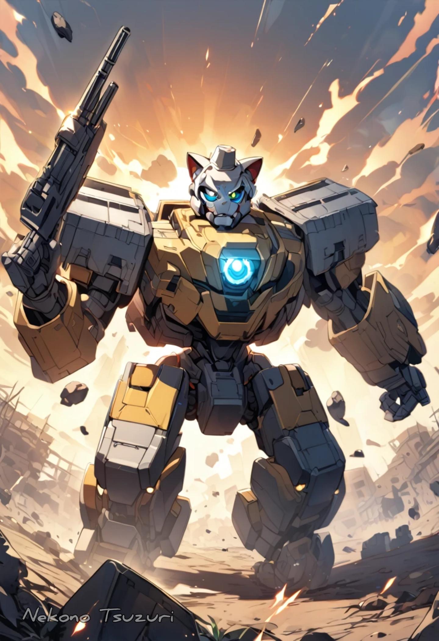 全てを破壊するメカ、涙を流しながら、