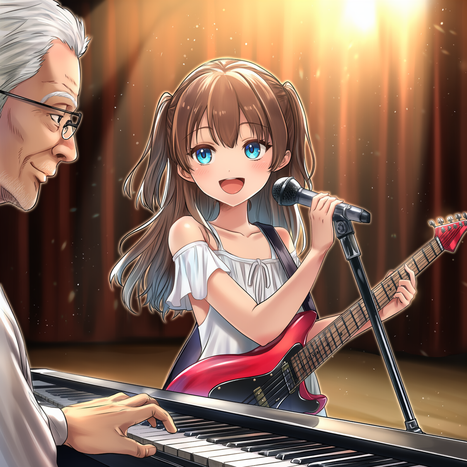 boy, old man, white hair, stubble, glasses, play piano, pianist, light smile, half-closed eye, hand motion,