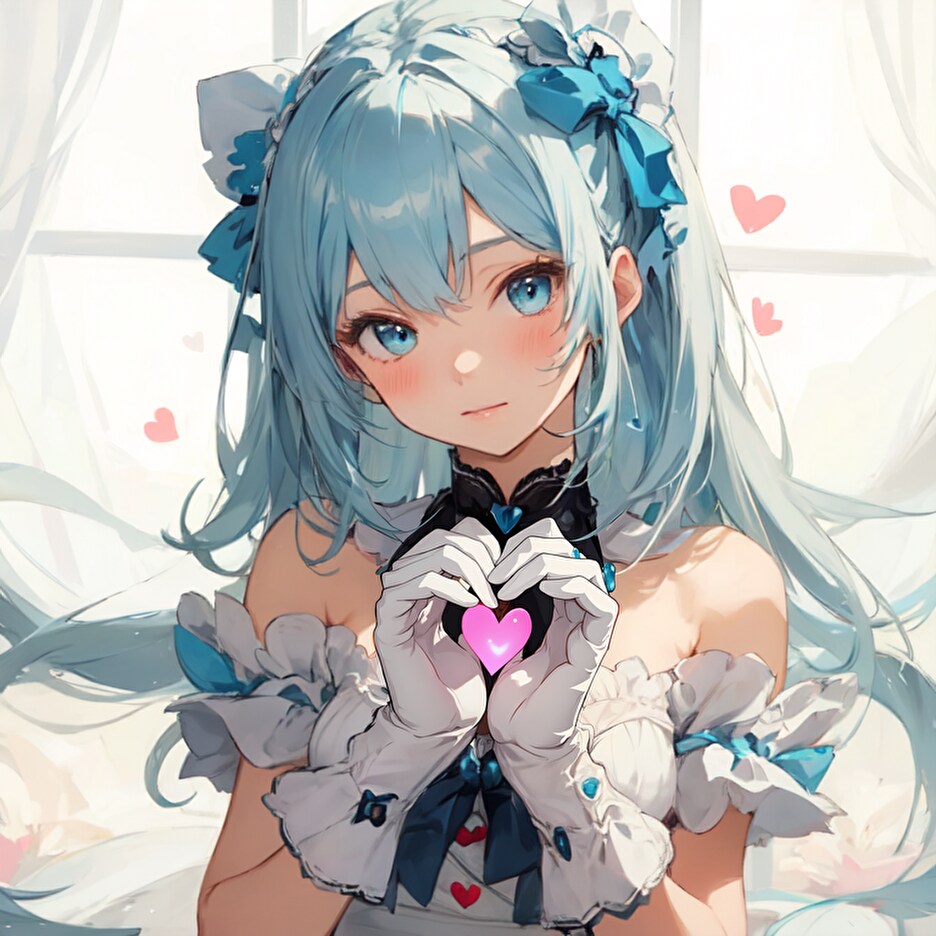 手修正画像する前のベース画像のプロンプト:masterpiece, best quality, 1girl, kawaii, light blue hair, white gloves, hands holding heart, in the maid cafe