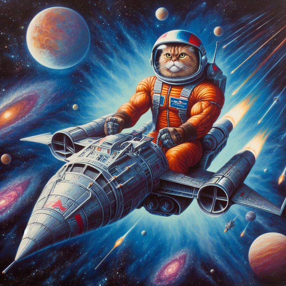 アクリル&1970年代SF映画&レトロ風、宇宙船で宇宙を旅する筋肉猫
