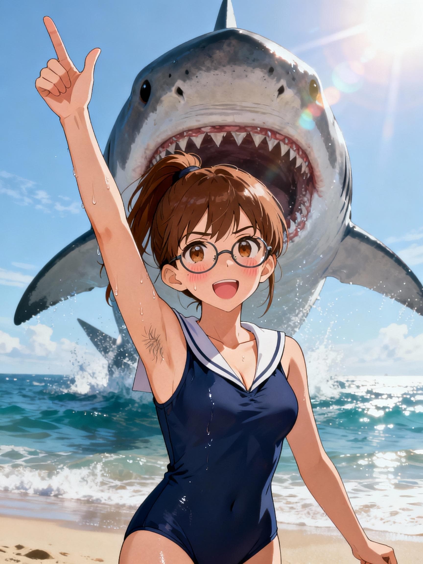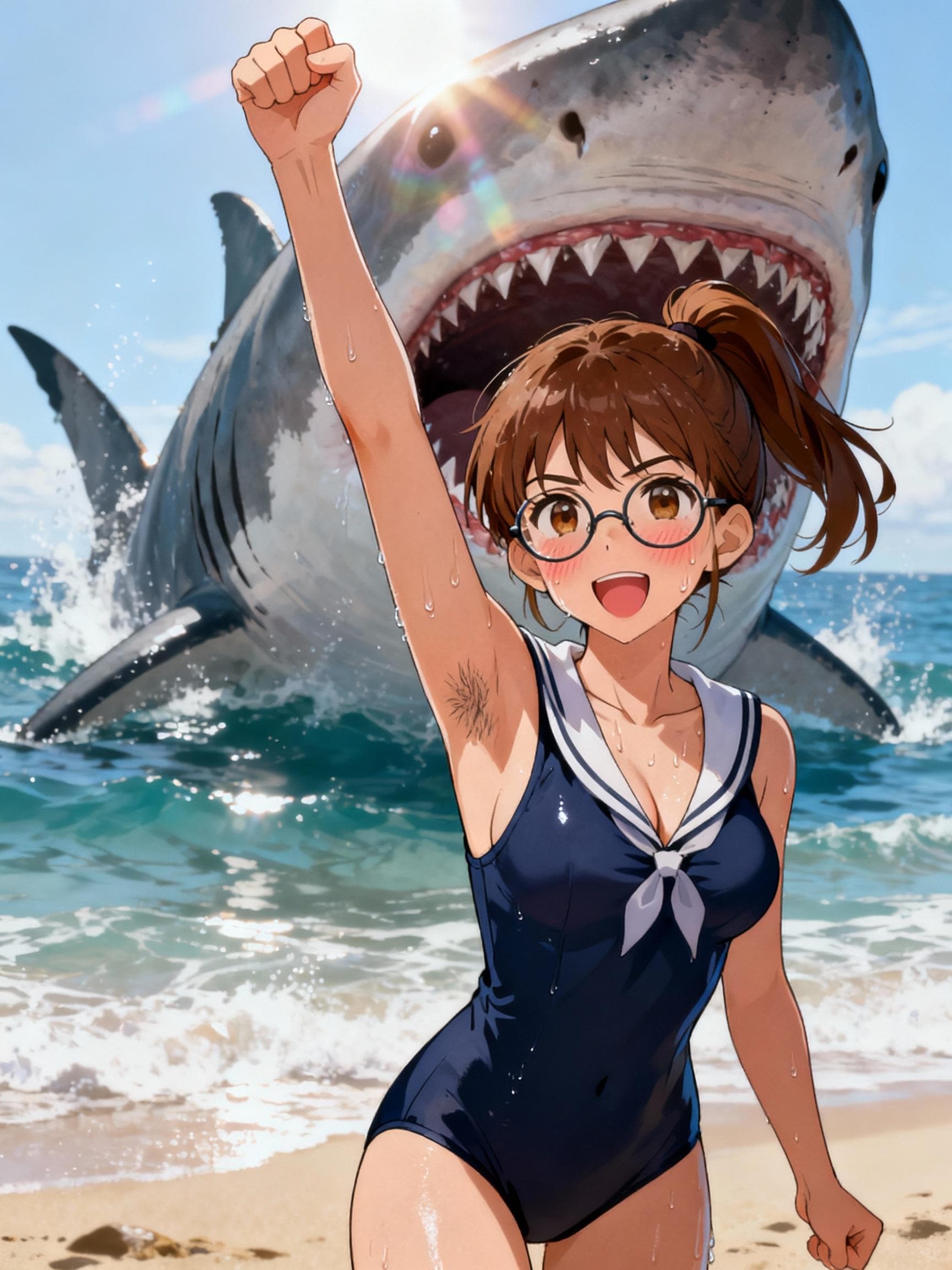 ①〜④はSeedreamで生成した画像をGeminiで加工、わき毛を濃くし水着をシンプルなスク水風に修正してある。