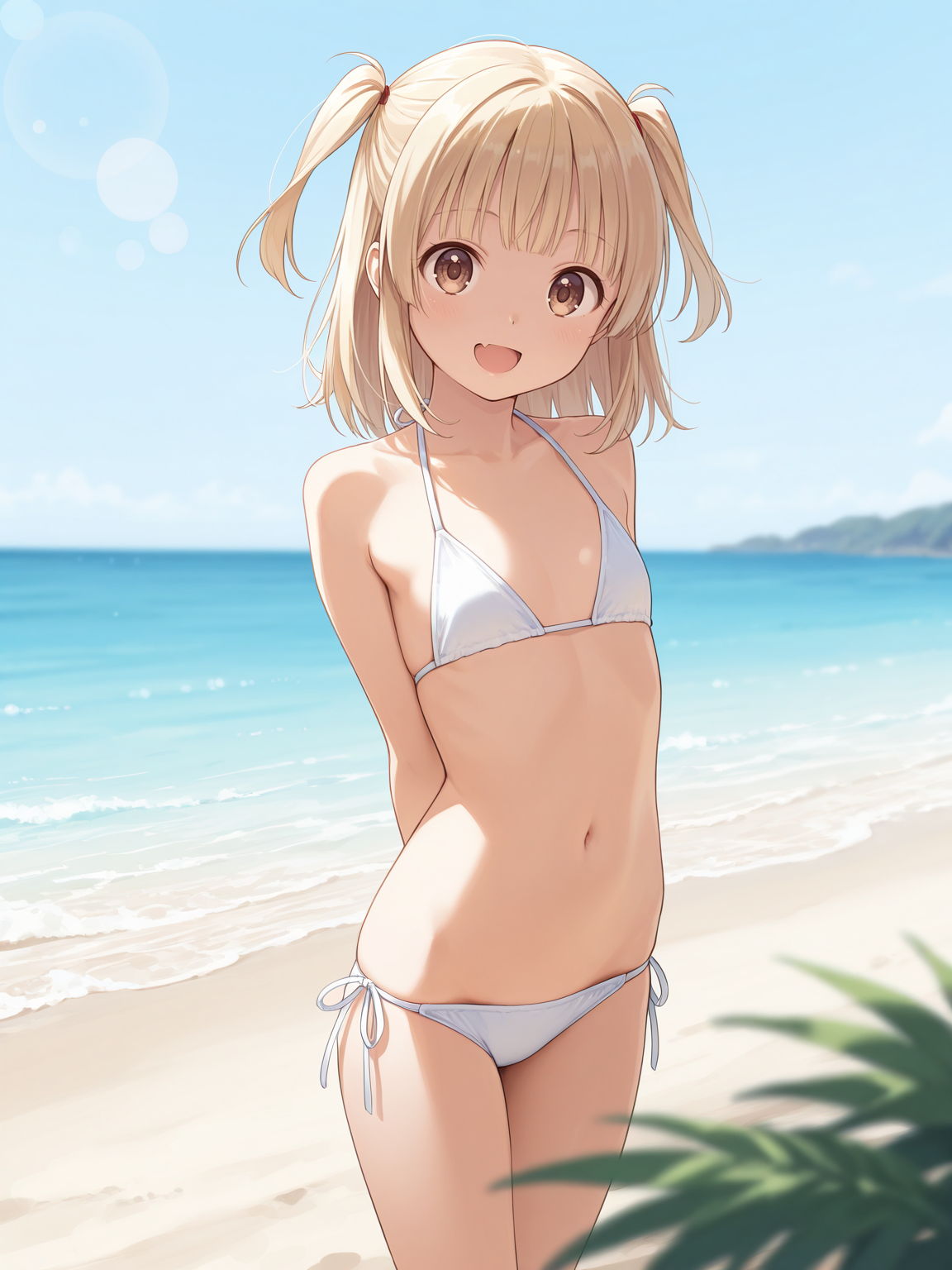 特徴:金髪、ツーサイドアップ、大きな茶色の目、八重歯