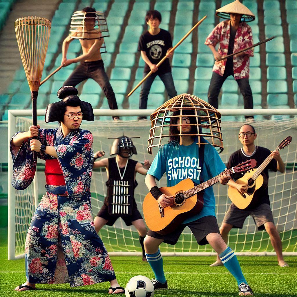 kimono, guitar, and, school swimsuit, wooden bat, soccer stadium