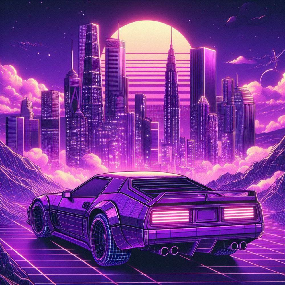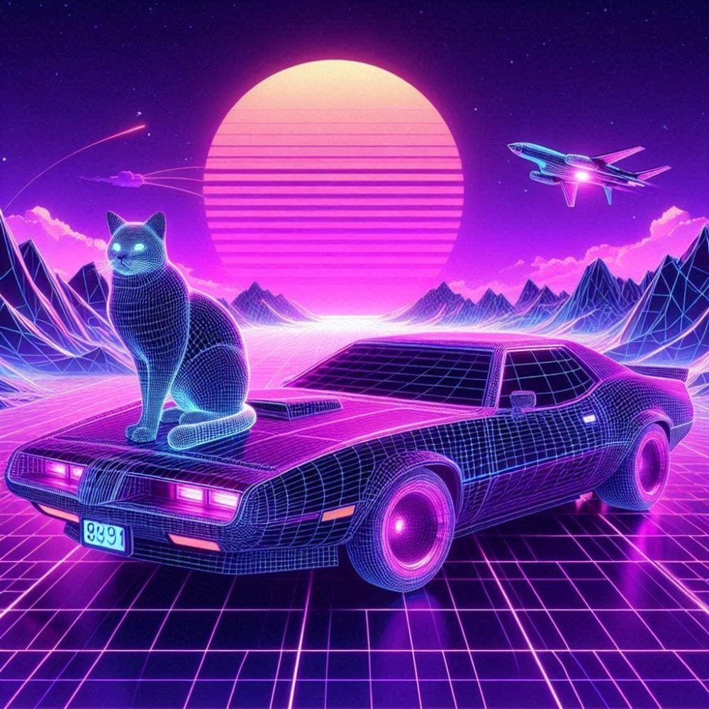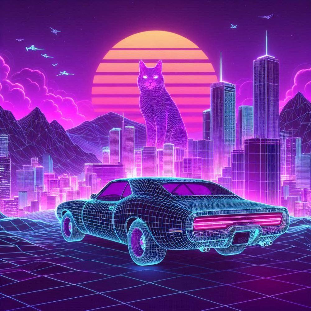 近未来SFサイバーパンク&1980年代&ワイヤーフレーム3DCG風、紫の猫