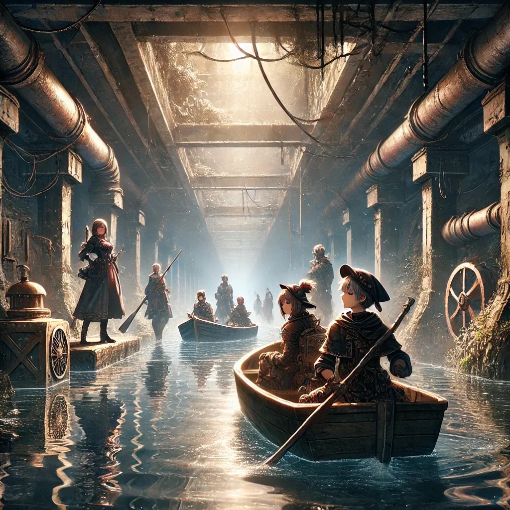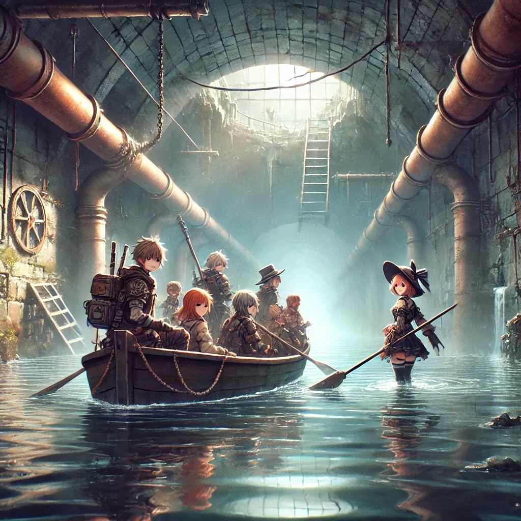 冒険者たちが水路を慎重に進む姿には、未知の領域に踏み込む緊張感と、それでも探求をやめない好奇心が感じられます。
