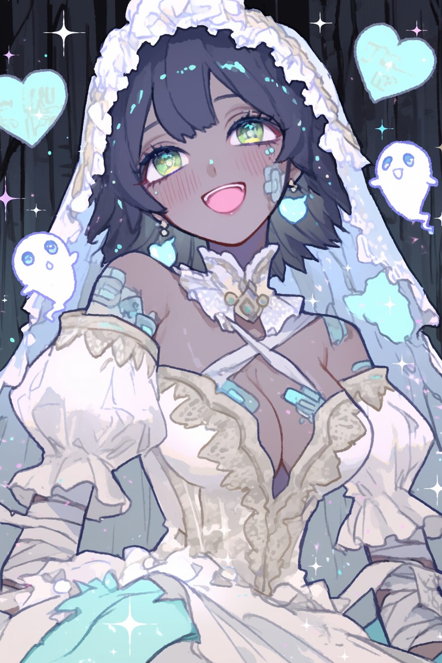 幽霊たちに見守られながら、幸せそうな花嫁。祝福の光が彼女を包み込む。