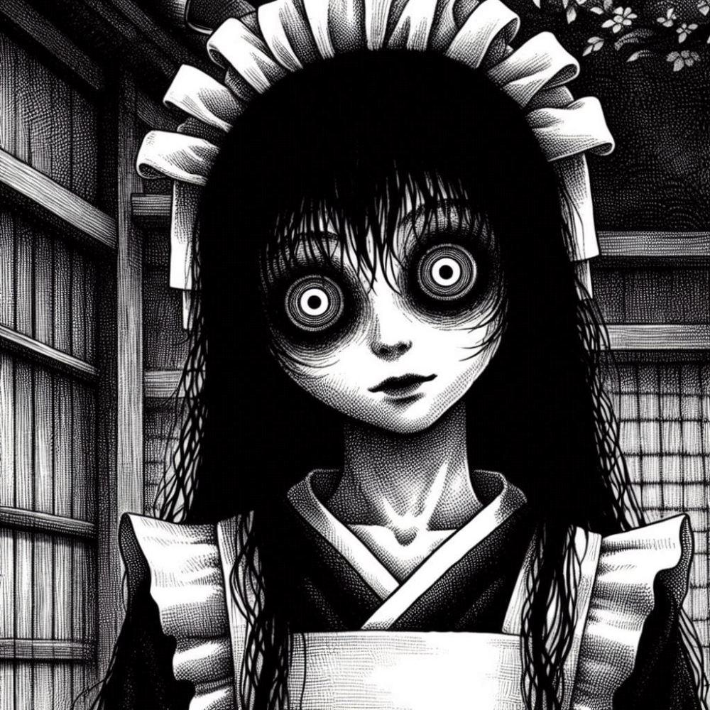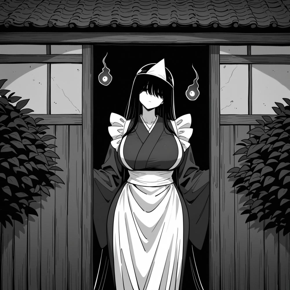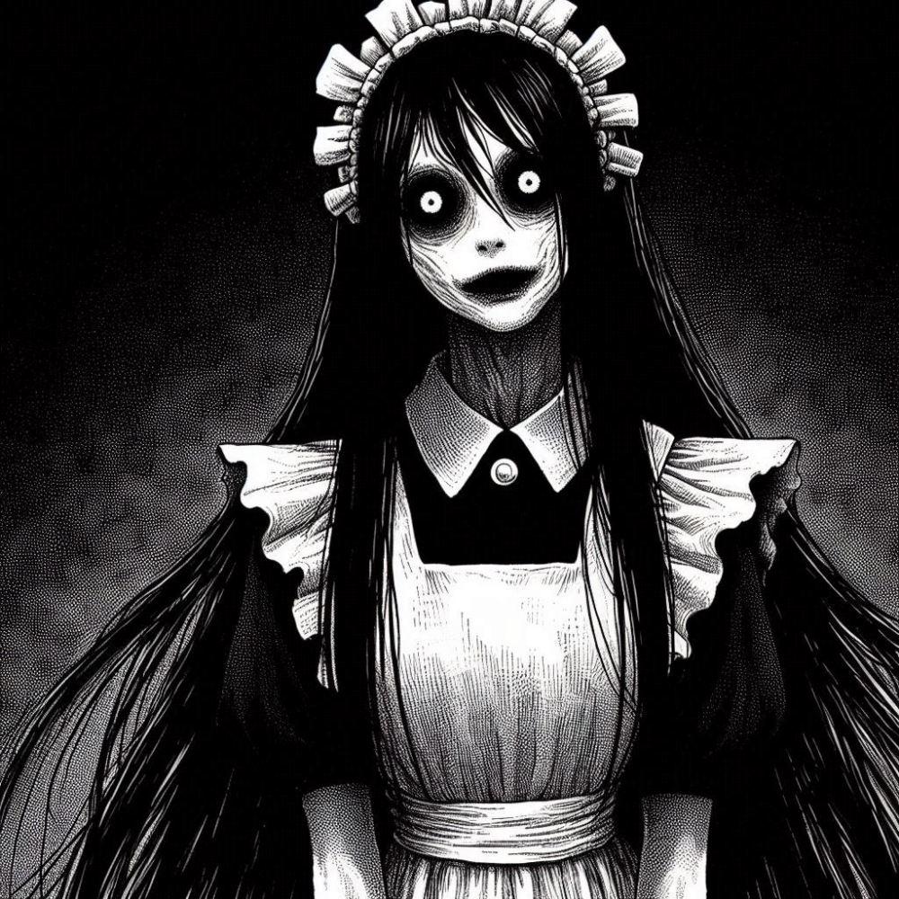 ホラーモノクロペン画風和メイドコスプレ人妻八尺様