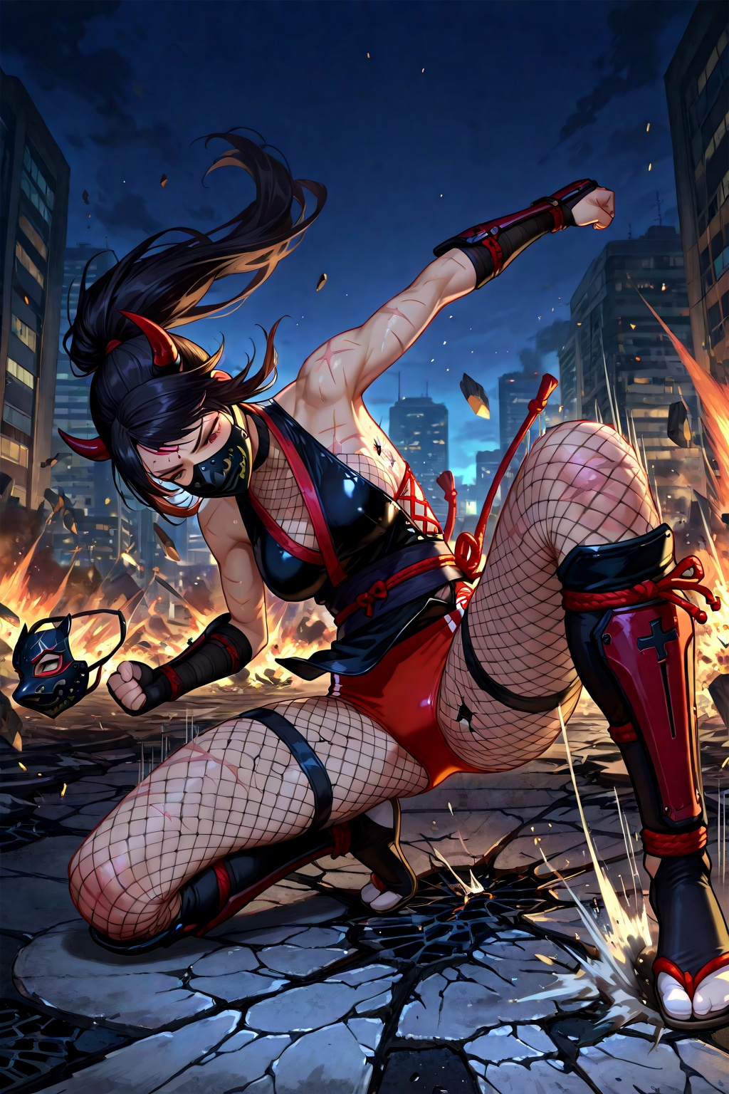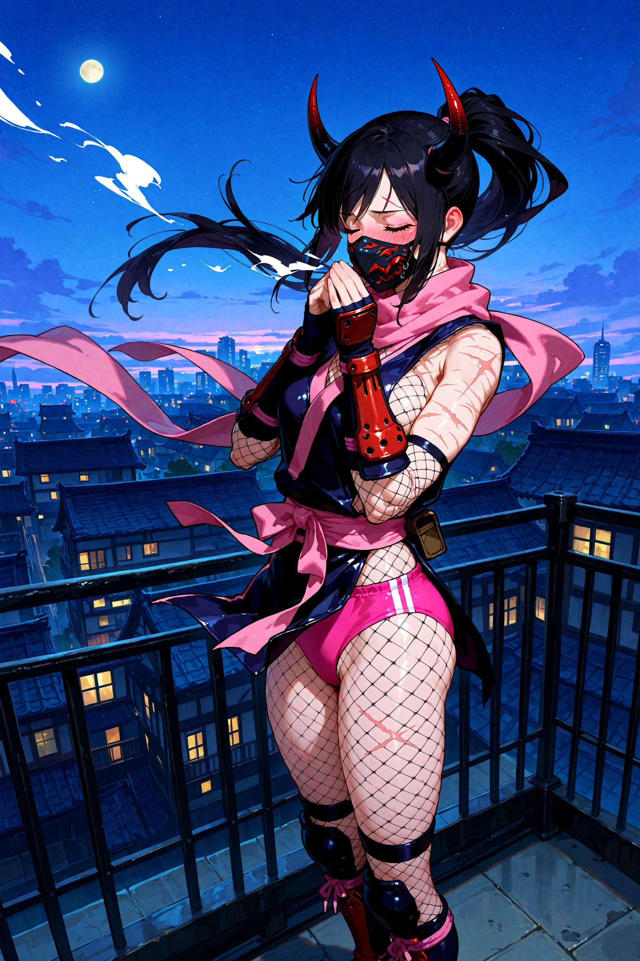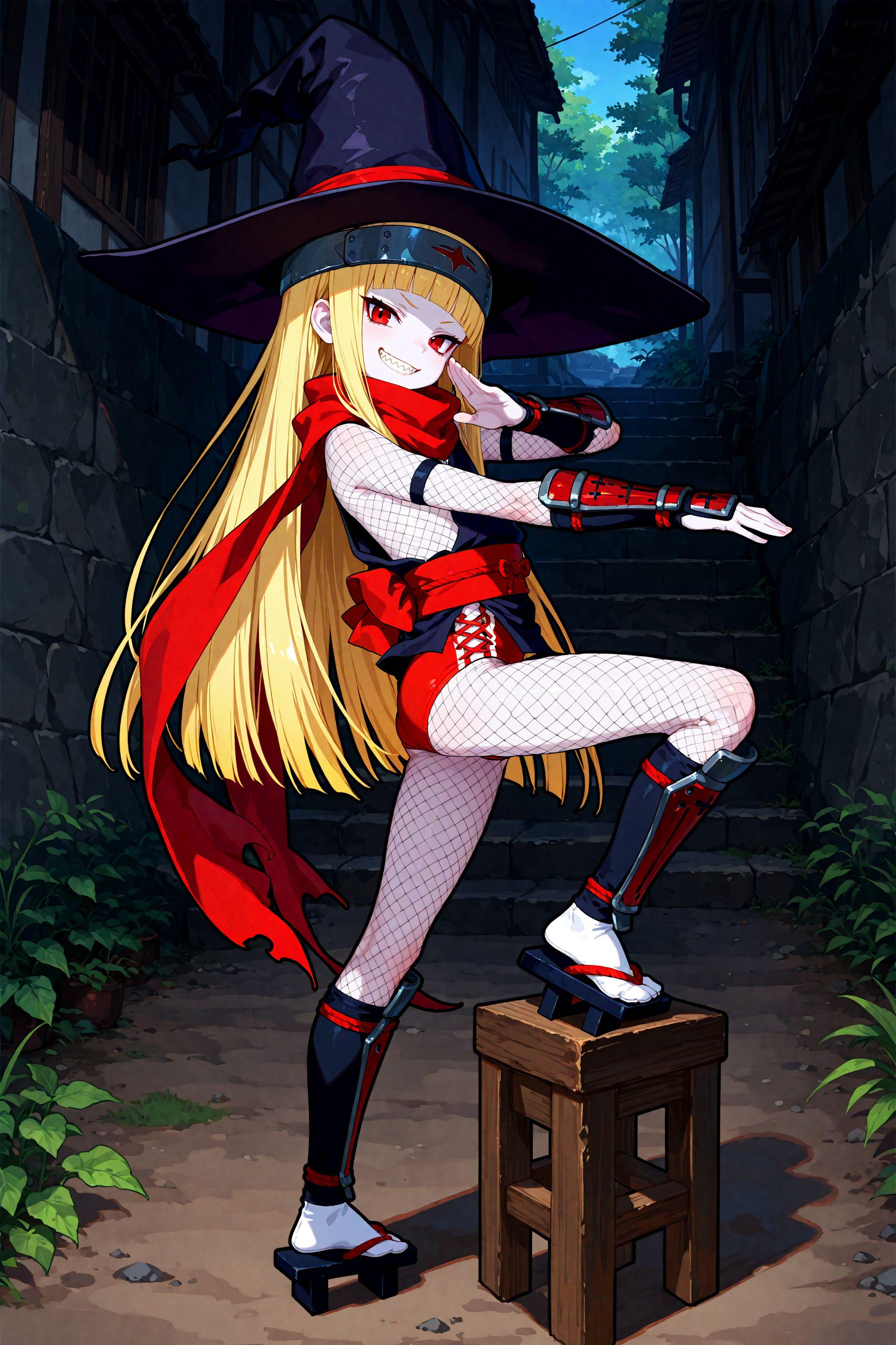 我が家の忍ルマは、【sideless outfit, arm guards, leg guards,(Fishnet bodystocking,fishnets:1.3), cross-laced clothes,forehead protector,metal headband,(scarf,srash:1.1),obi,geta,tabi】とすることにしました!メイヘムのみとんがり帽子を被せます。