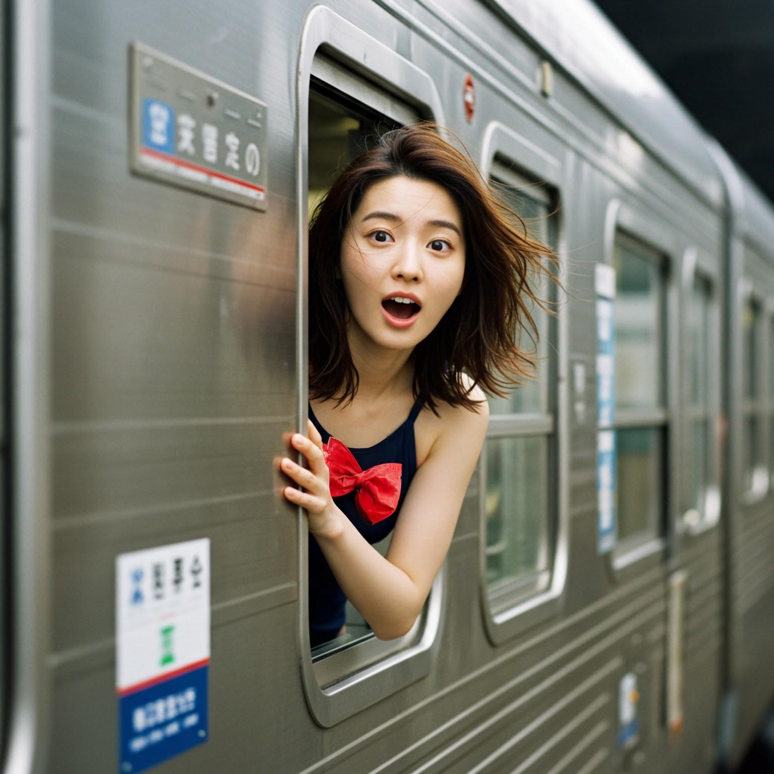 彼女はすかさずそれにまたがり、加速する電車と一体化するように突進する!