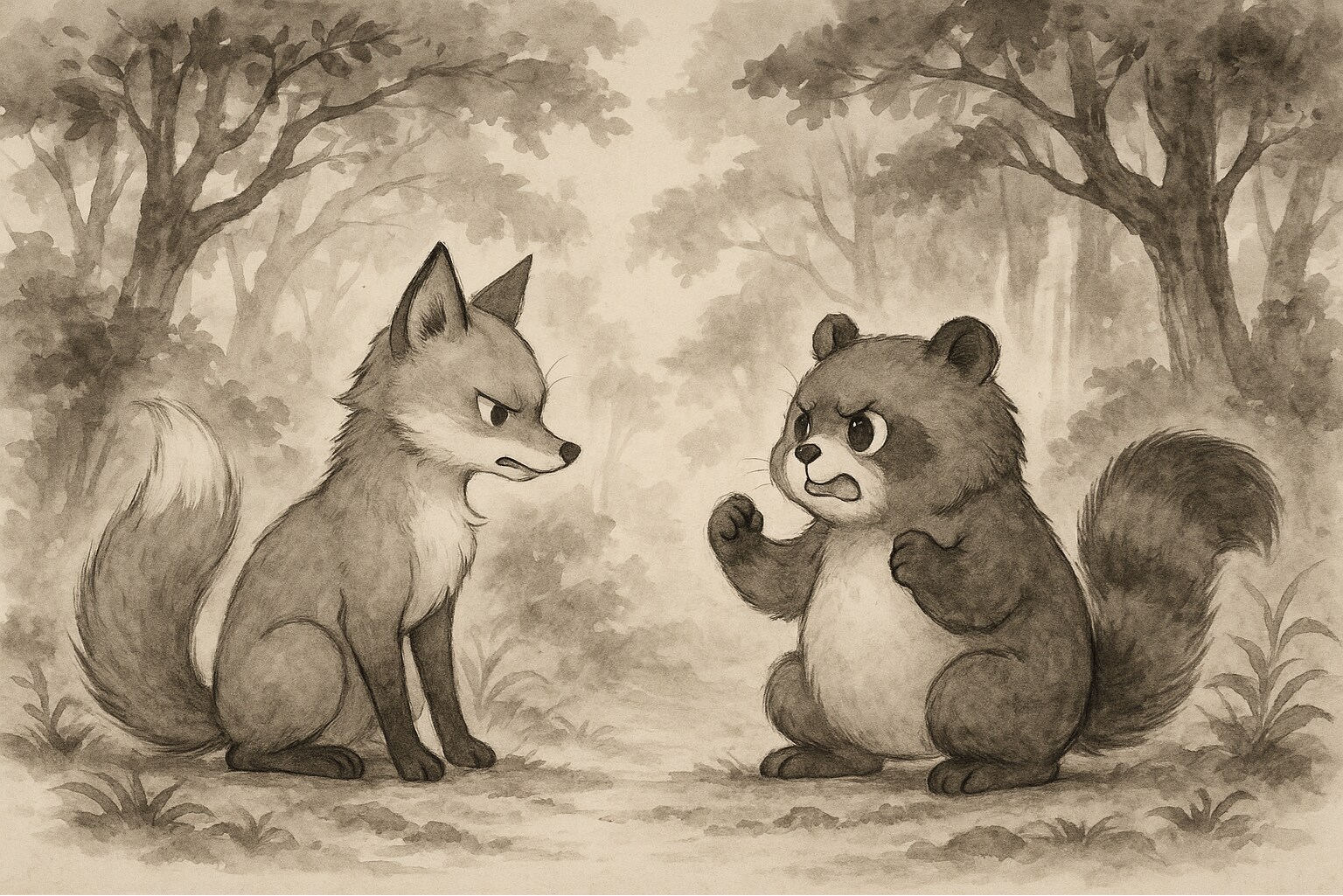 睨み合う狐と狸は、まるで言葉なき約束を交わしているかのよう。
