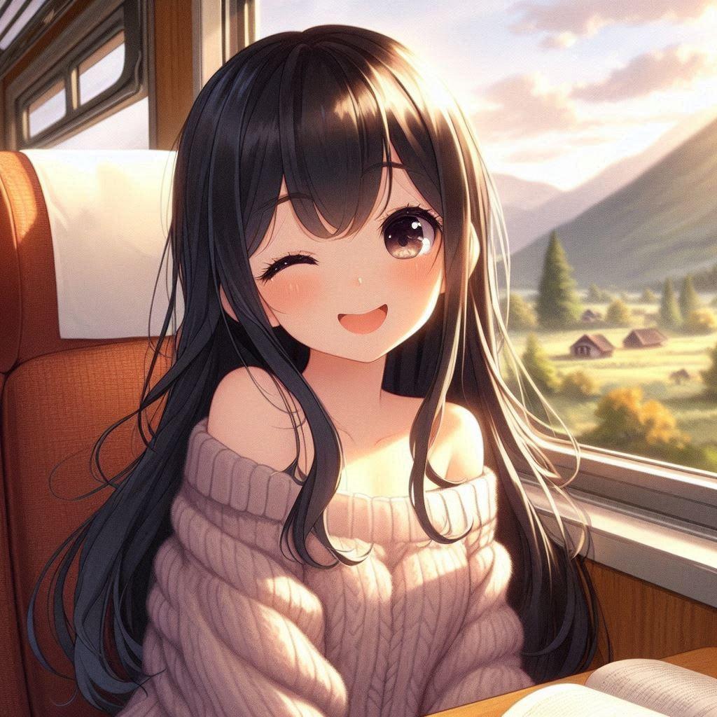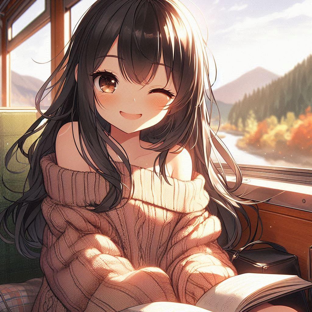 意図:セーターを着た元気な女の子が、列車の旅で窓際の席に座り、外の田園風景を眺めながらウインクをしているシーンが描かれています。秋のカジュアルな装いで、暖かい日差しが彼女を包み込み、優しい笑顔とリラックスした雰囲気が漂っています。穏やかな風景と本を手にした姿が、旅の平和なひとときを表現しています。