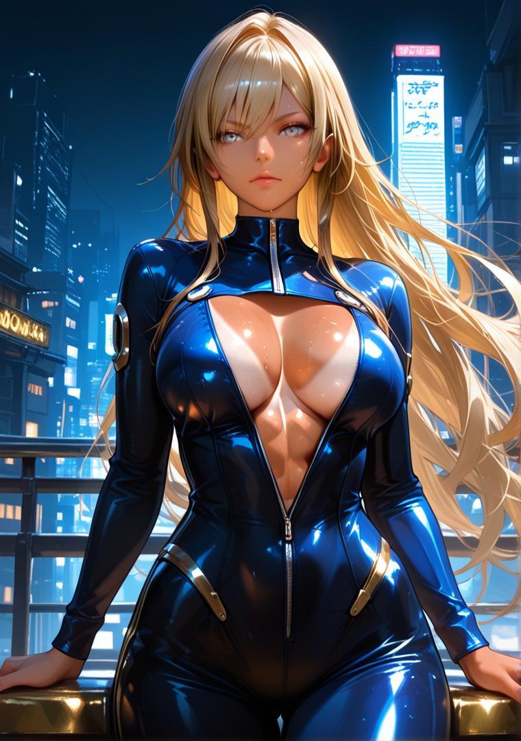 sapphire blue stretch catsuit, faint shimmer, close-fitting cut # サファイアブルーのストレッチキャットスーツ、ほのかな輝き、体に沿うカット