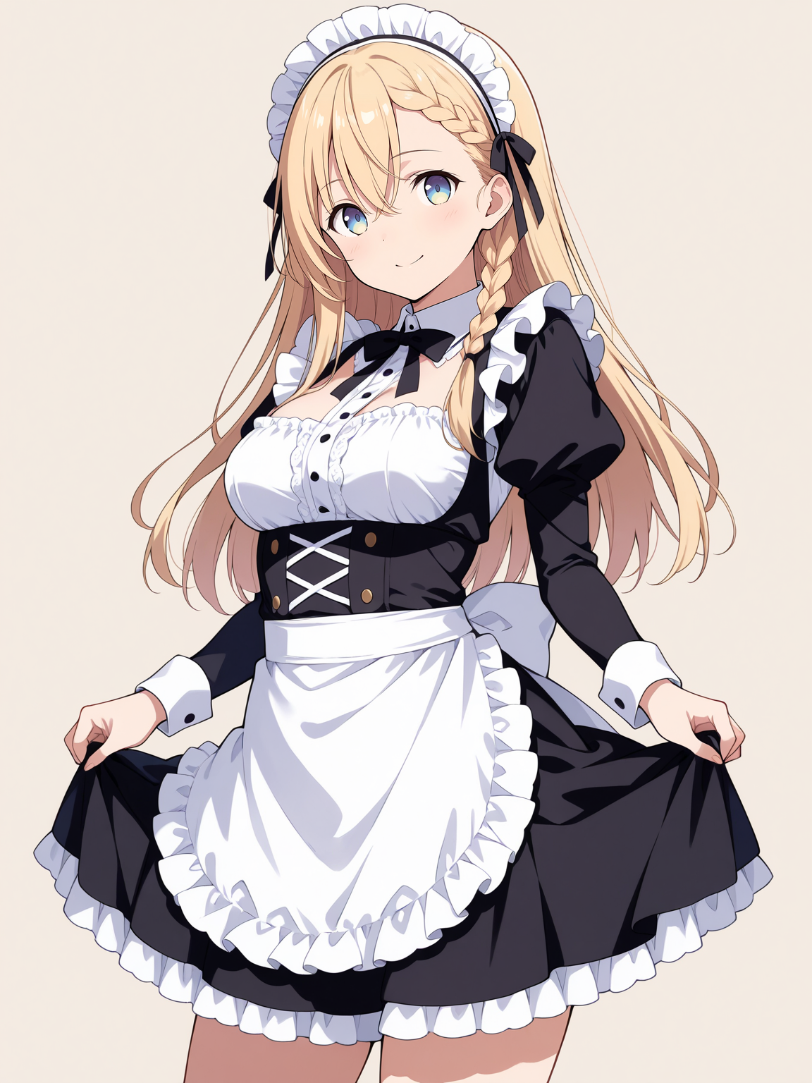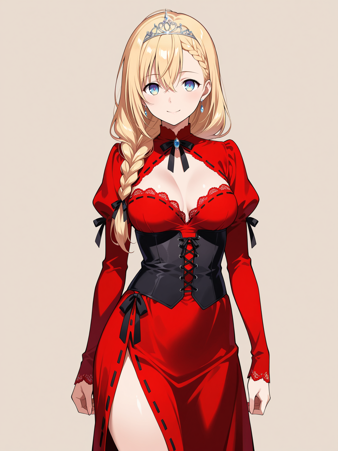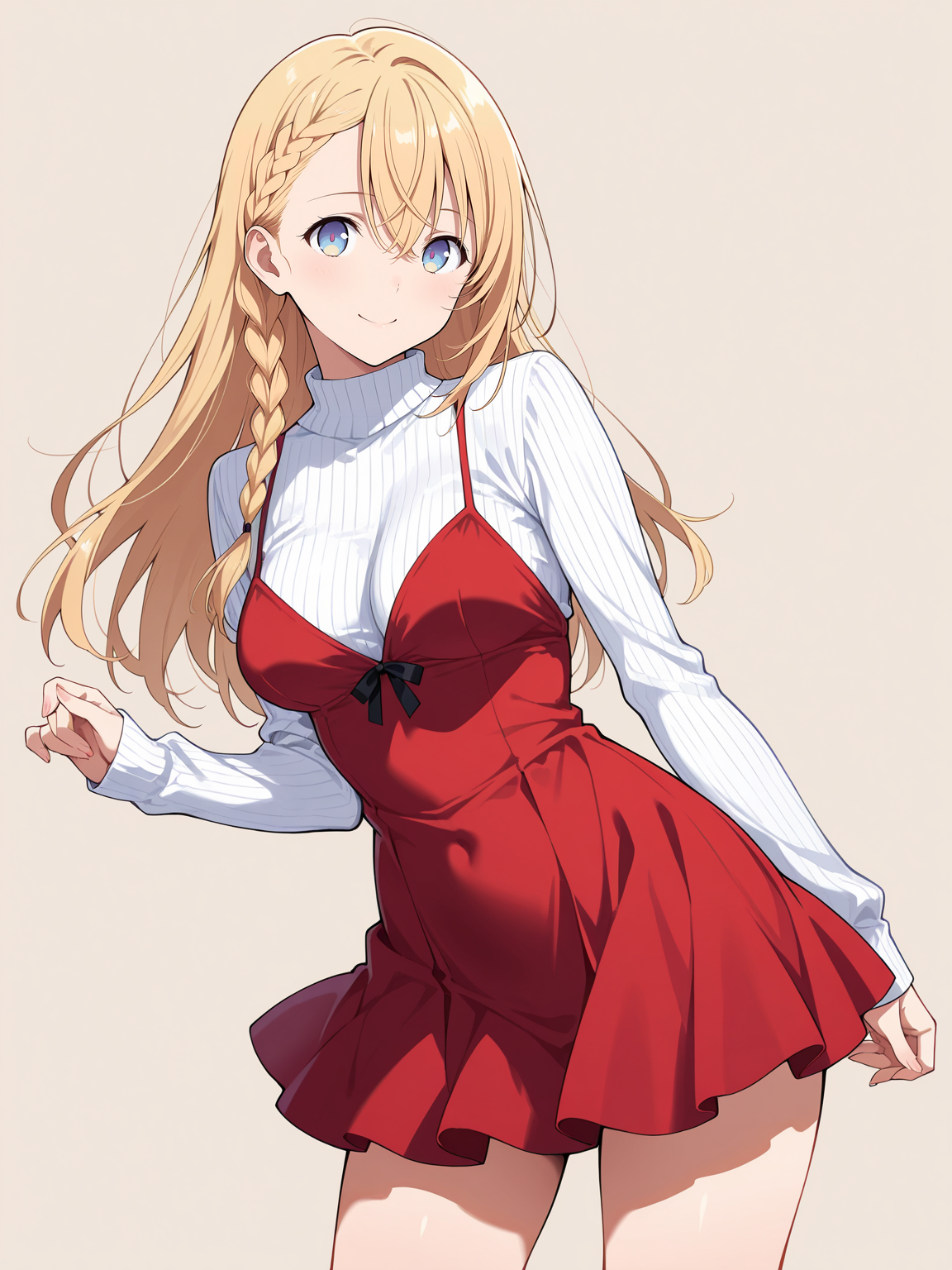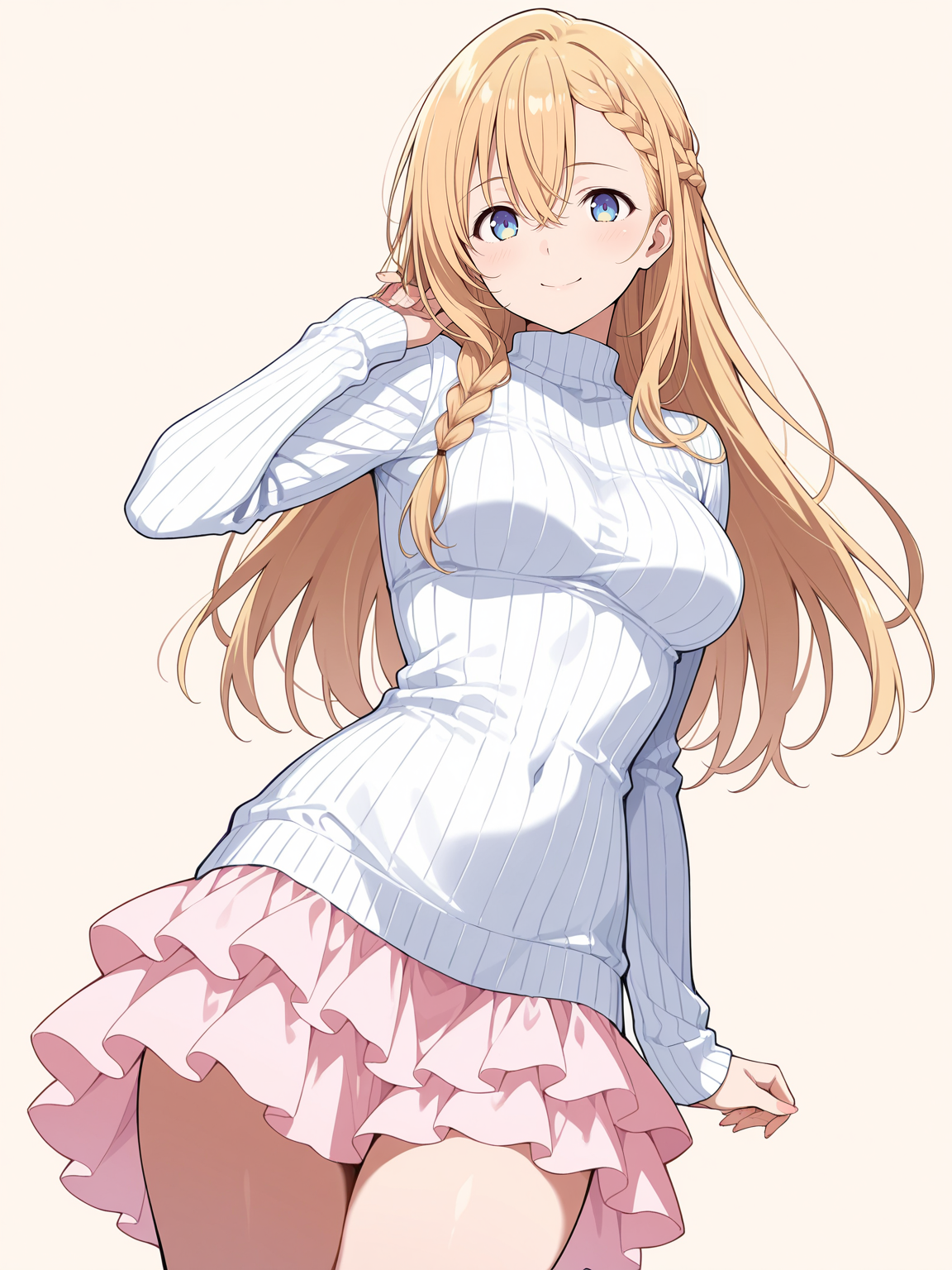 1girl,bishoujo,early teen,curvy,petite,long face,blonde hair,long hair,left side braided bangs,hair between eyes,blue eyes,gradient eyes,no_pupils,pointed nose,medium breasts,