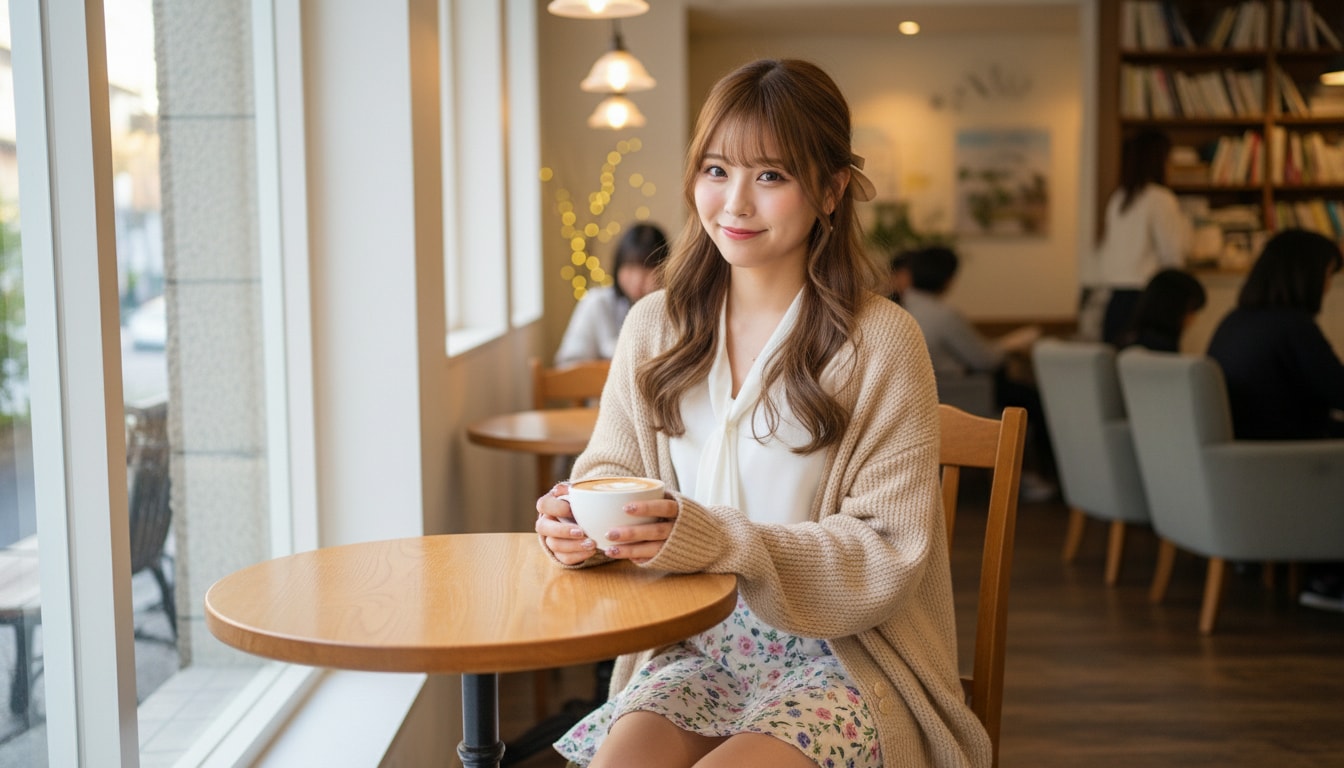 「新作のラテ、すごく可愛いんです!えへへ、お花柄スカートと一緒にお出かけです♪」