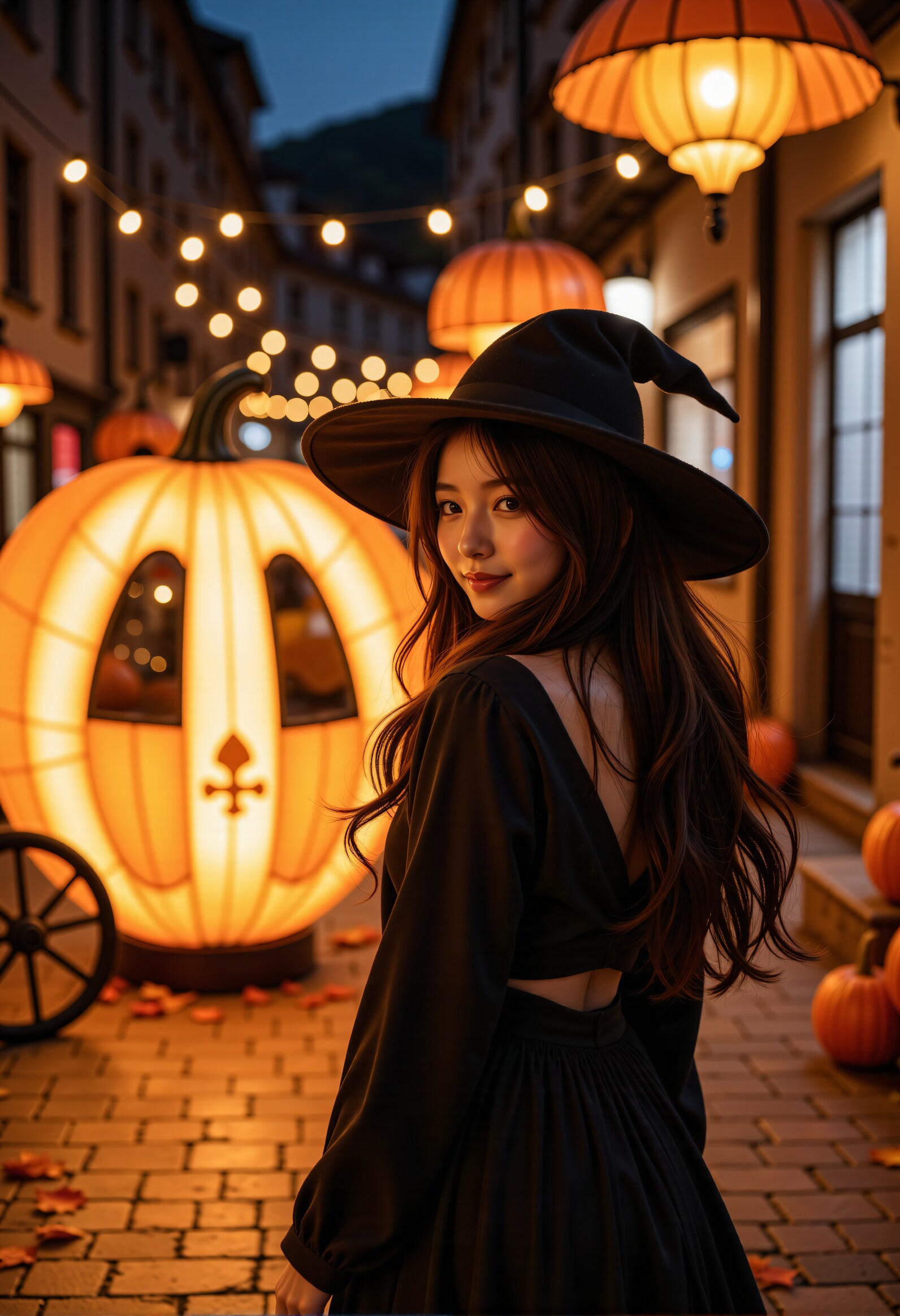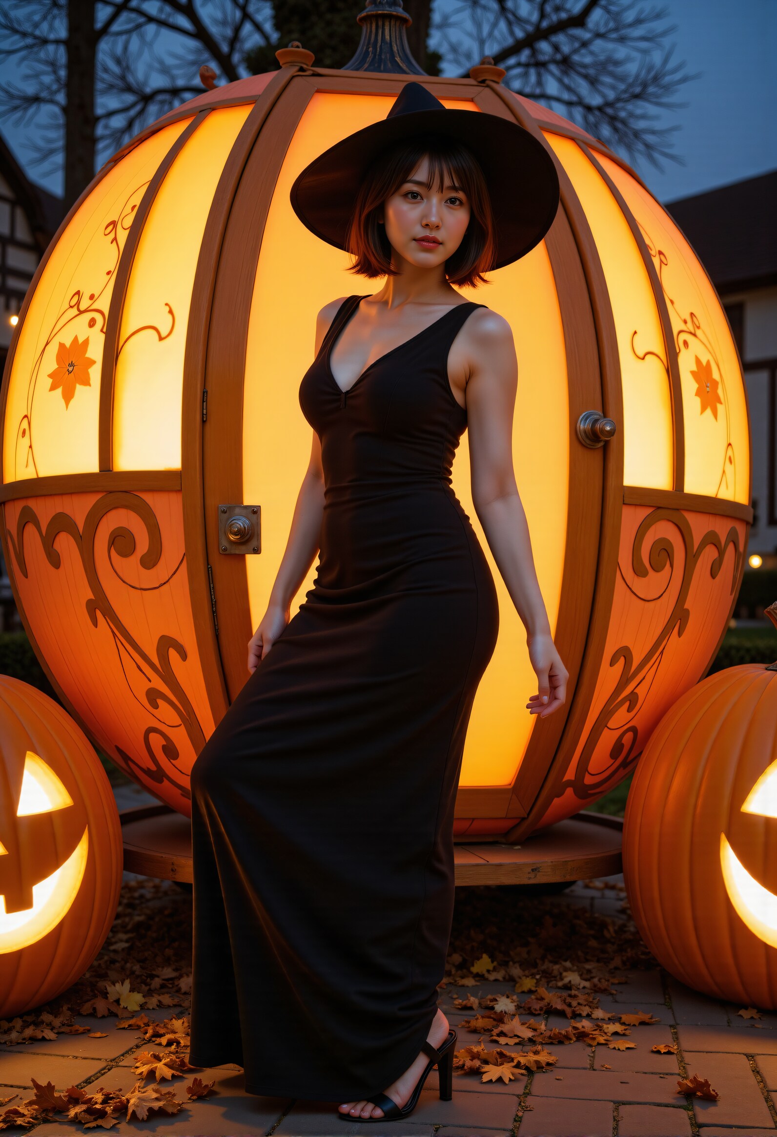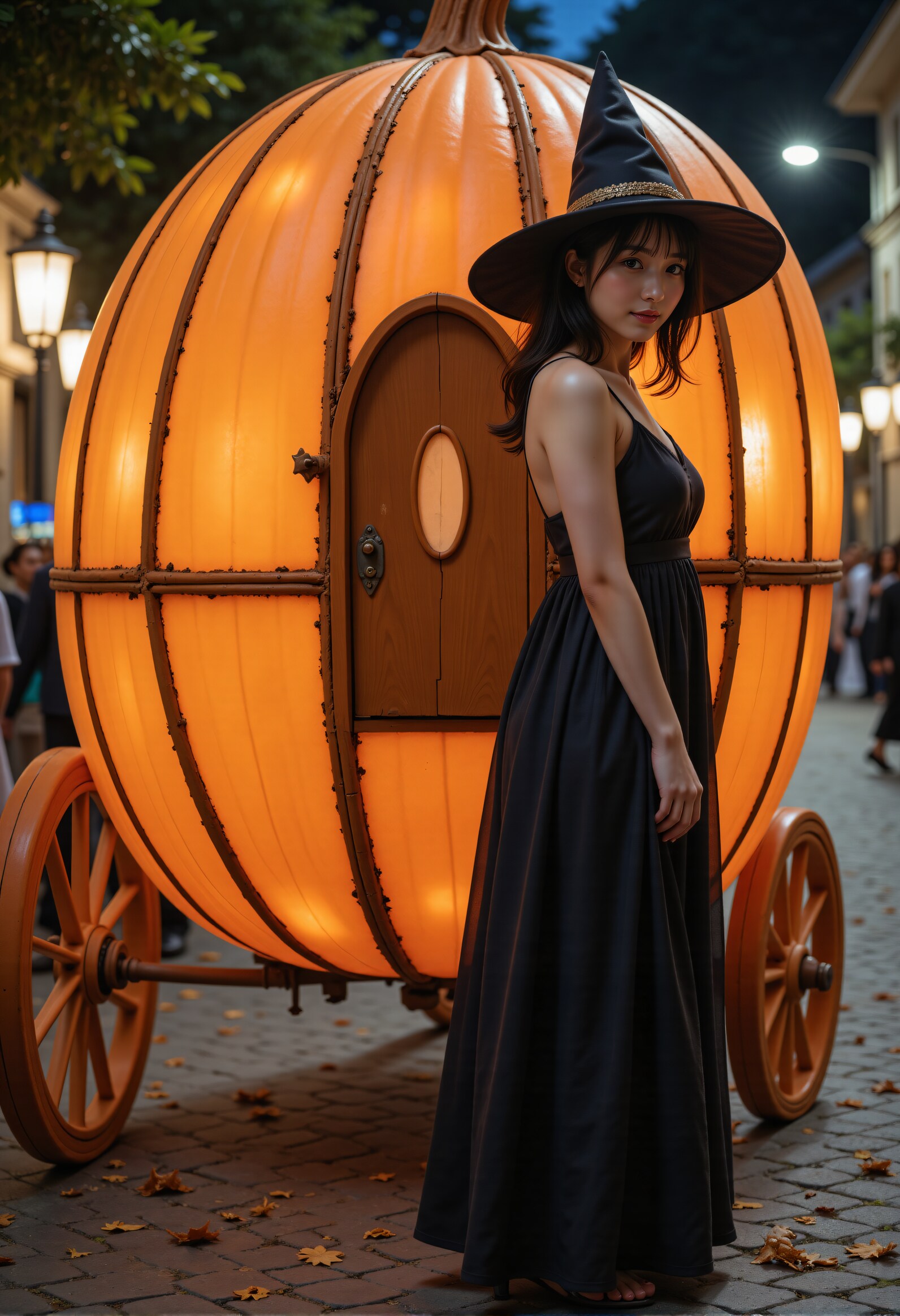 Steps: 50, Sampler: Euler, Schedule type: Simple, CFG scale: 1, Distilled CFG Scale: 3.5, Seed: 3343548850, Size: 832x1216, Model hash: 3f97fdc57a, Model: flux1-dev, Denoising strength: 0.4, ADetailer model: mediapipe_face_full, ADetailer confidence: 0.8, ADetailer dilate erode: 4, ADetailer mask blur: 4, ADetailer denoising strength: 0.3, ADetailer inpaint only masked: True, ADetailer inpaint padding: 32, ADetailer version: 24.11.1, Hires prompt: "RAW photograph of japanese_woman witch in maxi dress and wide brim hat and cinderella's pumpkin carriage made of a pumpkin and carriage door and autumn leaves on halloween night magic.\nHer hair sways in the wind. kind smile.\nluminous pumpkin\nbeautiful legs , low heels reveals\nthrough the streets of medieval streetscape\n\nfull body shot, from below, low angle shot, deep depth of field,captured with Fujifilm X-T4 and XF 35mm f/1.4 R lens\n\nbob cut,\nfeminin,kind,mild,gentle and neat girl,beautiful girl who is modest and obedient\ndetailed cute eyes,detailed beautiful face\nShe is looking at viewer with loving expression and kind smile on her face.\n\n<lora:kurumi_flux_lora_v1:0.1>,<lora:anzu-flux-LoRA_v22:0.1>,<lora:Ashley:0.2>,<lora:JasmineFluxV1:0.2>,<lora:anego_tomomi:0.2> <lora:anego_ameri:0.2>,<lora:japanese_woman:0.1>\n<lora:FluxDFaeTasticDetails:0.2>\n <lora:90log_v3:0.1> 90LOG-PHOTOGRAPHY\n<lora:Be_luminous_flux_lora:0.4> Be_luminous\n\n", Hires upscale: 1.6, Hires steps: 20, Hires upscaler: 4x-UltraSharp, Lora hashes: "kurumi_flux_lora_v1: 670f7ce330c0, anzu-flux-LoRA_v22: c03d2800cd05, Ashley: e675ff70810f, JasmineFluxV1: 1b4226e04b46, anego_tomomi: cc4ba8854f84, anego_ameri: bcf5ed0bde57, japanese_woman: 54f18680e104, FluxDFaeTasticDetails: 5be8e41a3a18, 90log_v3: e3b0c44298fc, Be_luminous_flux_lora: 15be3c374113", Version: f2.0.1v1.10.1-previous-528-ge55cde9b, Diffusion in Low Bits: Automatic (fp16 LoRA), Module 1: clip_l, Module 2: t5xxl_fp16, Module 3: ae