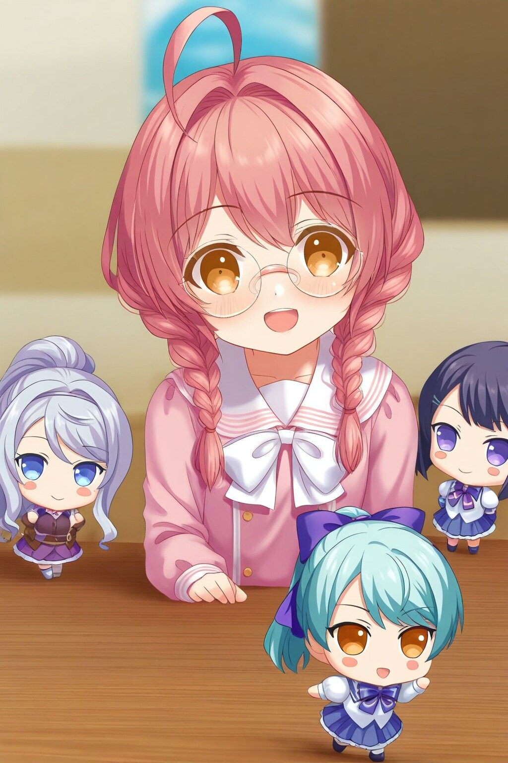 今回はねんどろいどのプロンプトにちょっと足して「miniature effect,Nendoroid, Chibi」、これに自分の名前である「眼鏡三つ編みのあるごす」を英語にして一緒にちちぷい生成に放り込んだものになります。