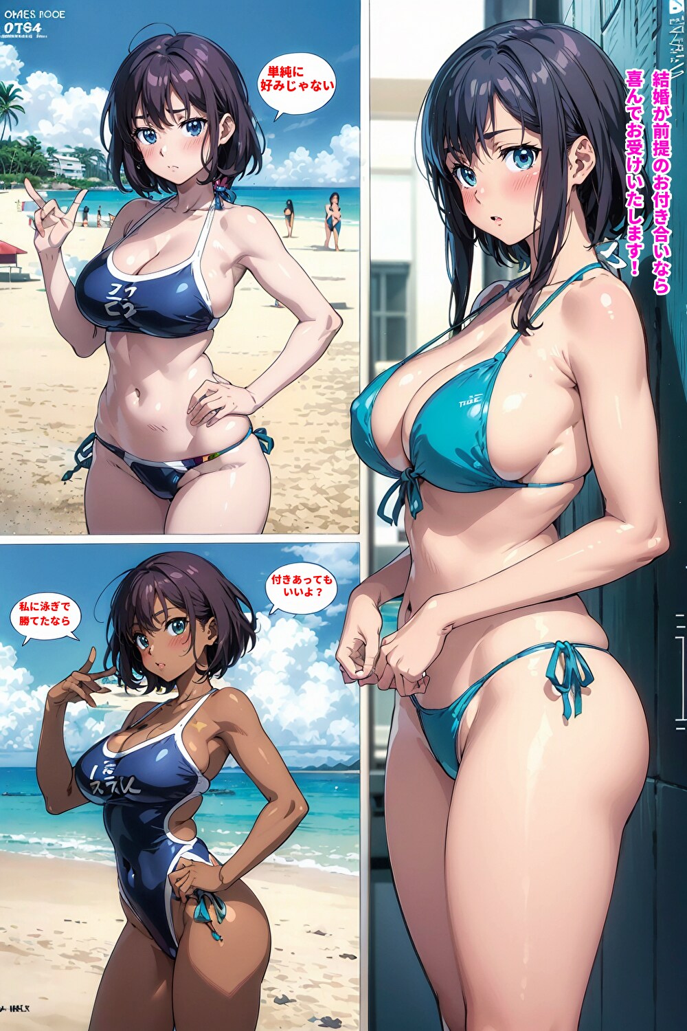 二人目の水着美少女(褐色スポーティ、競泳少女):「私に泳ぎで勝てたら・・・付きあってあげてもいいかな??」