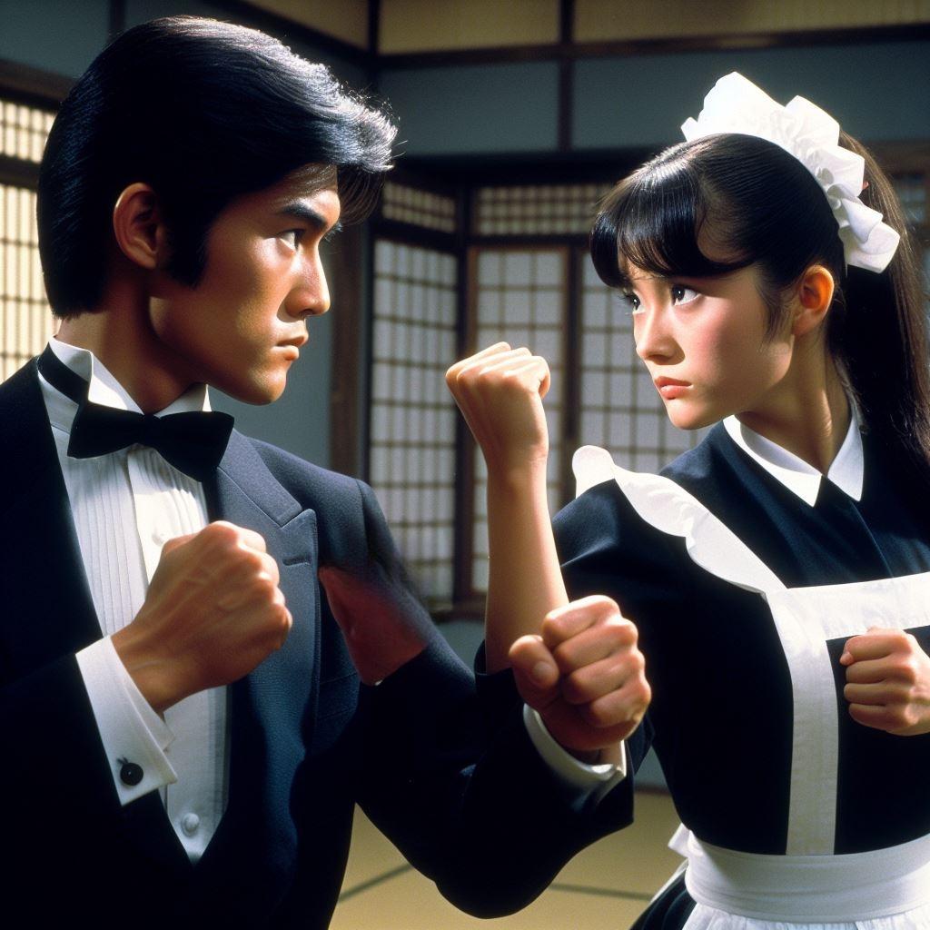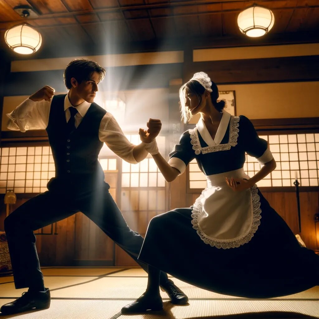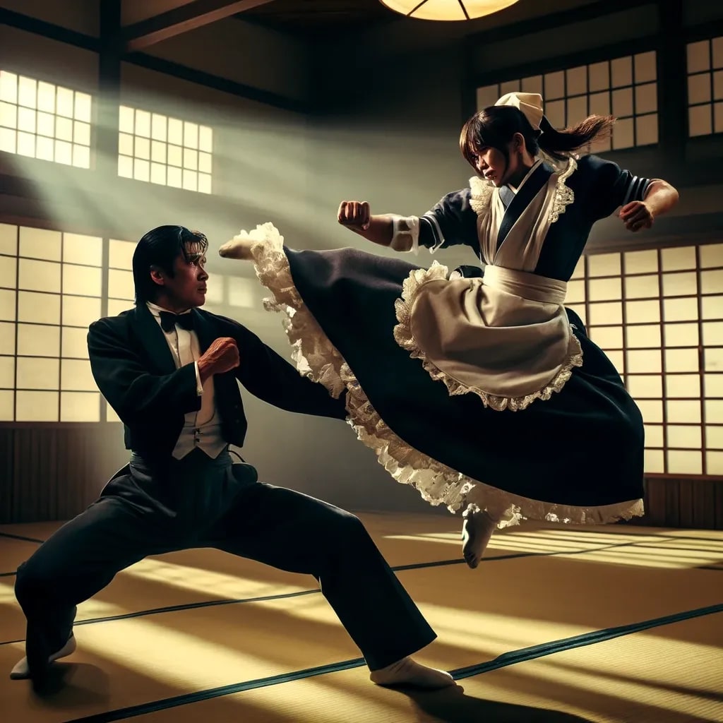 破壊音と共にメイドの蹴りが執事を完璧に捉えると、執事は道場に倒れ込んだ。