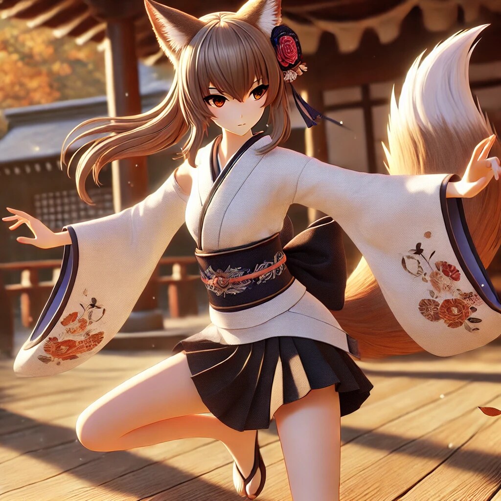 神社の境内で巫女舞を練習する彼女。スポーティーな体型を活かしたしなやかで力強い動きが特徴的。舞の途中でキツネの耳がピクッと動き、風に袖が優雅に揺れる。落ち葉が舞う中、集中した表情で踊る。