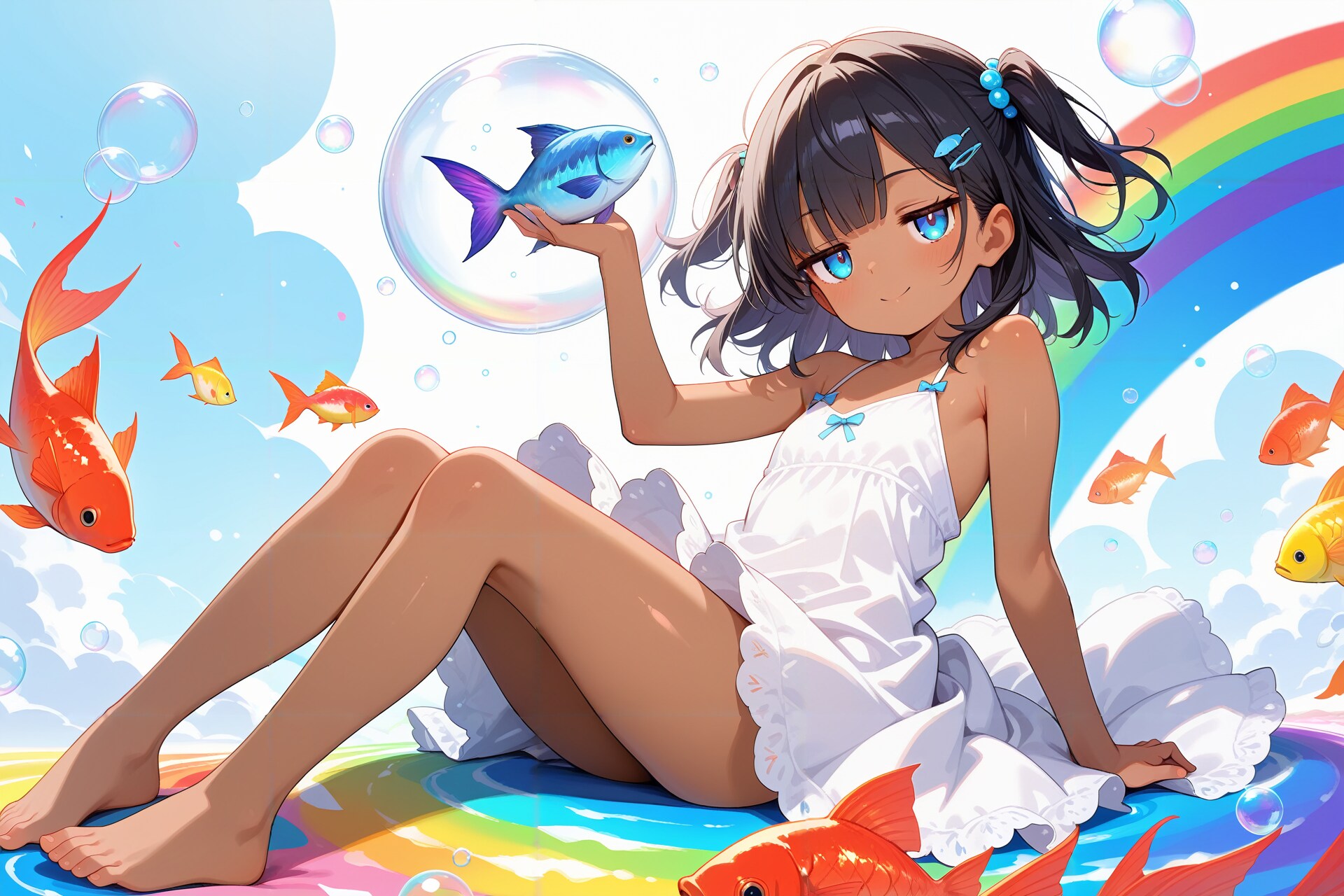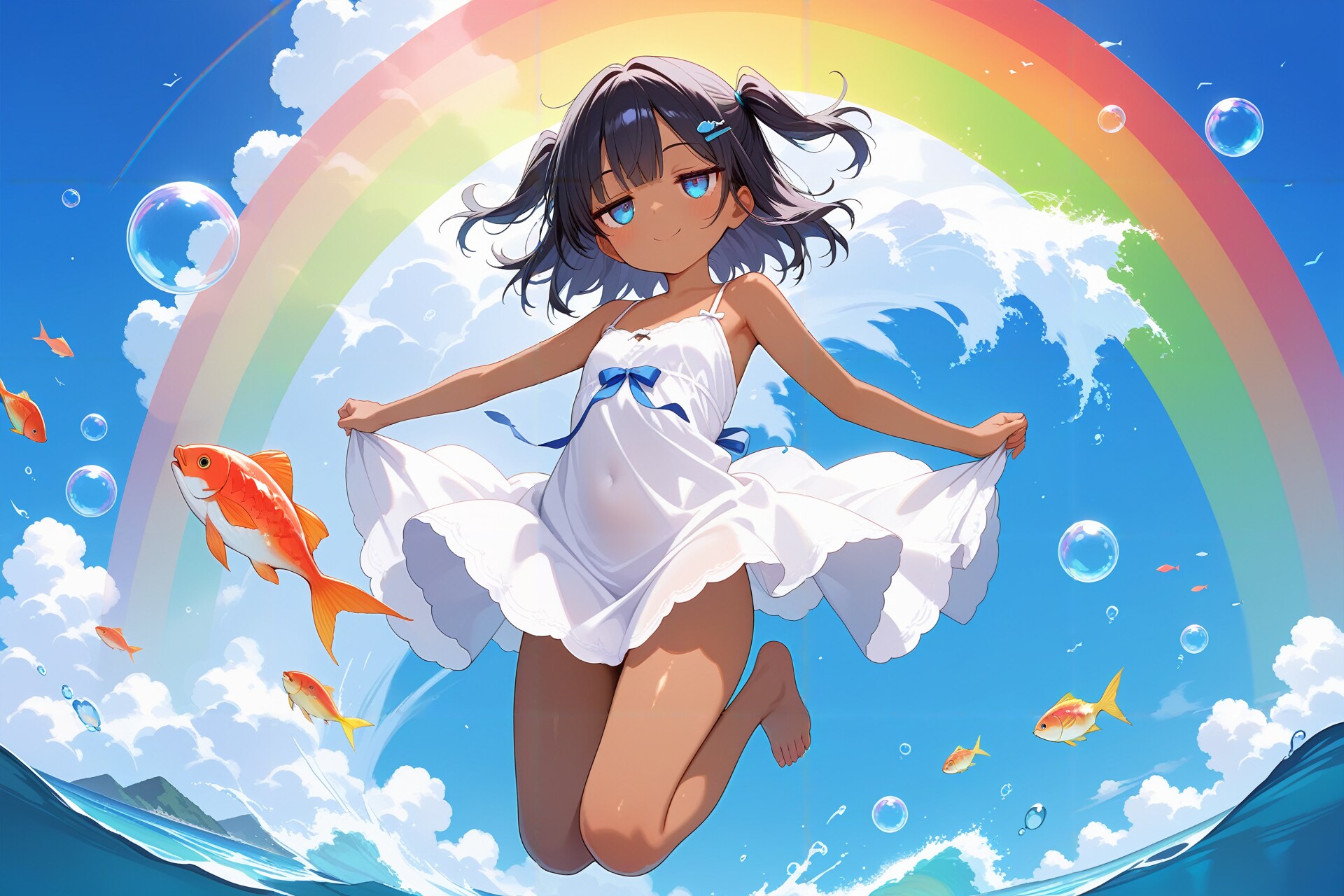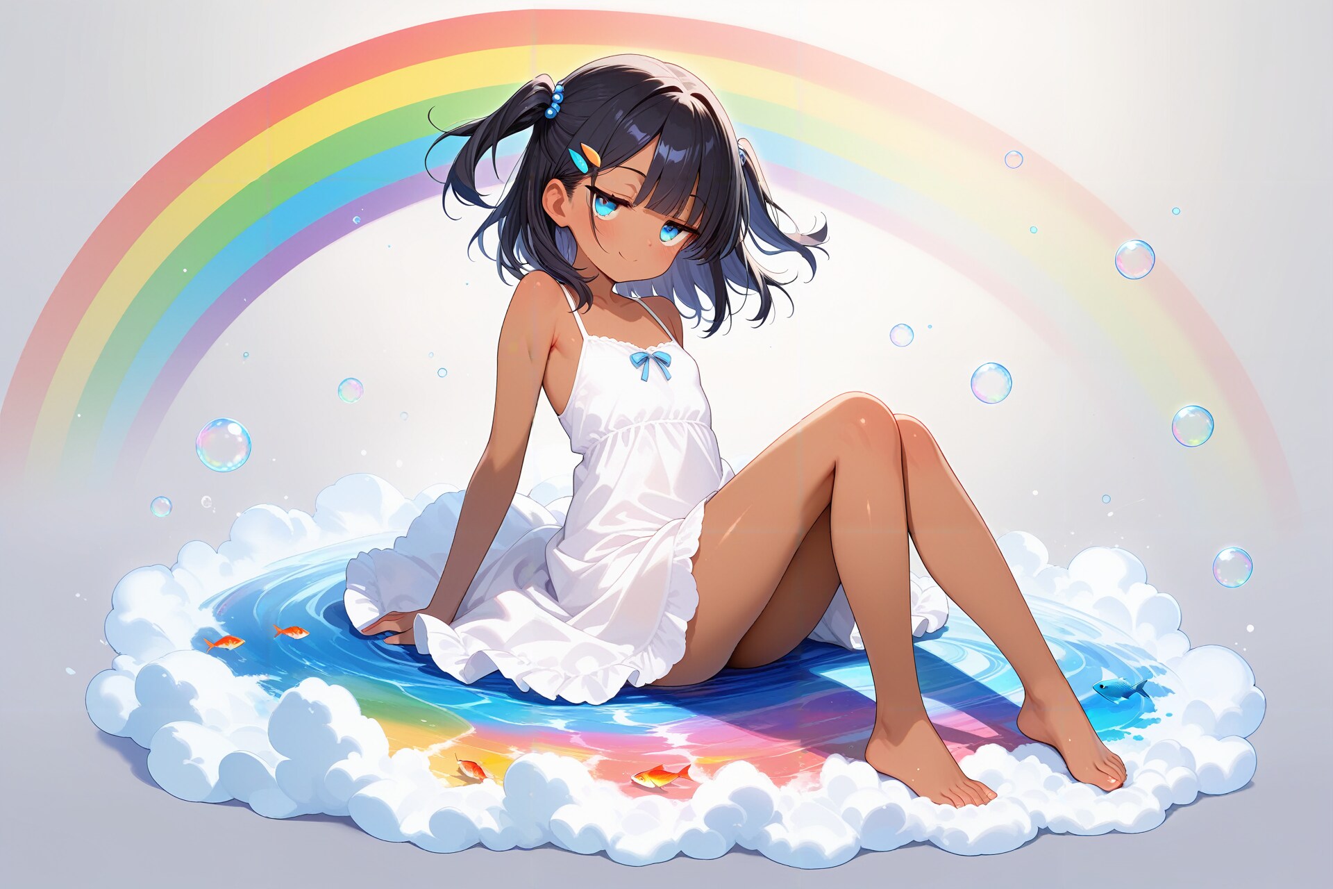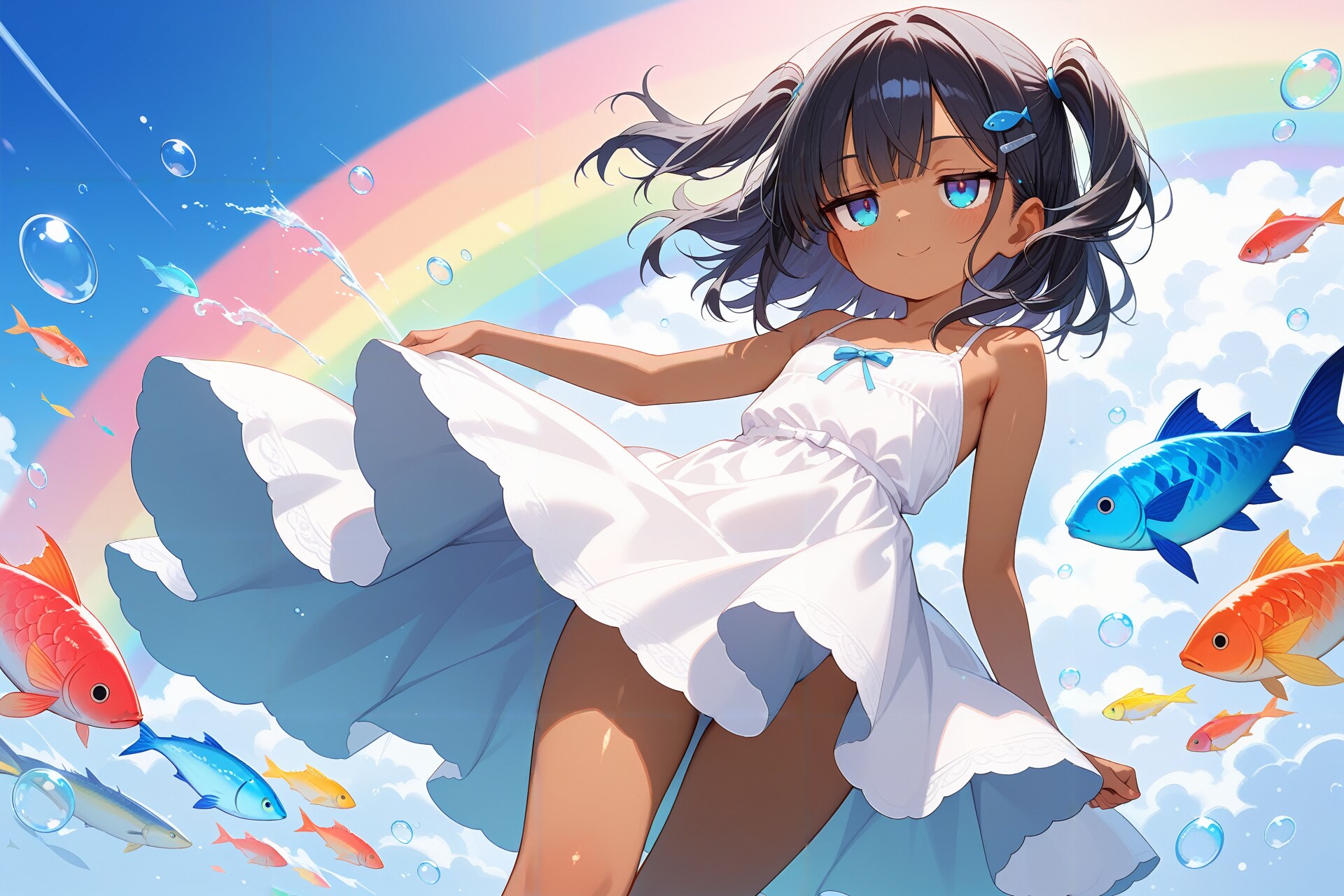 褐色少女にはカラフルな背景が映えるだろうと、虹に。あとはガチャして良さげなものを。