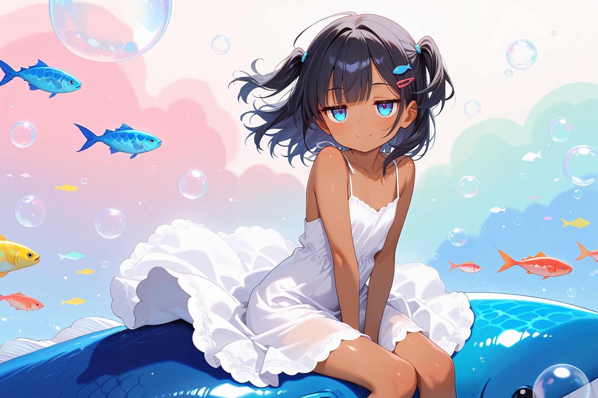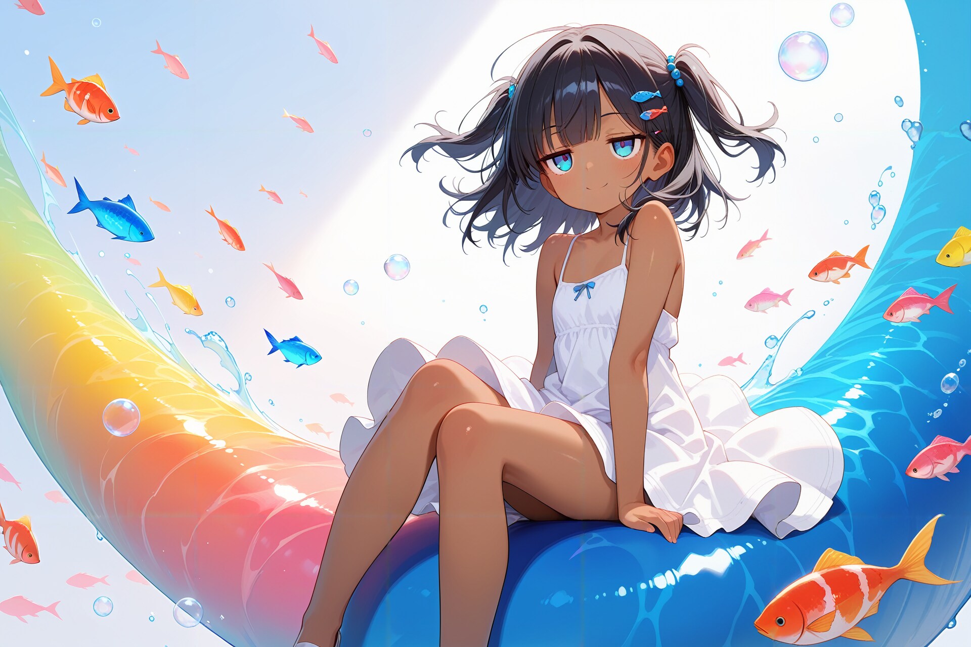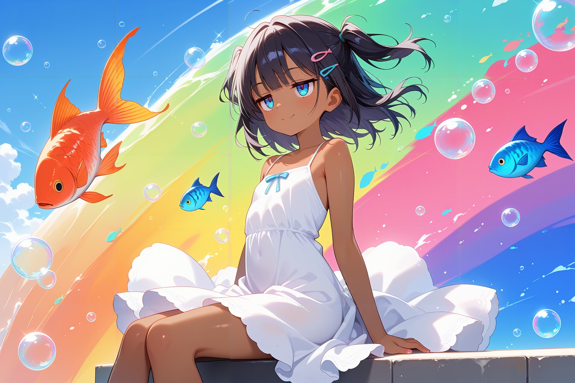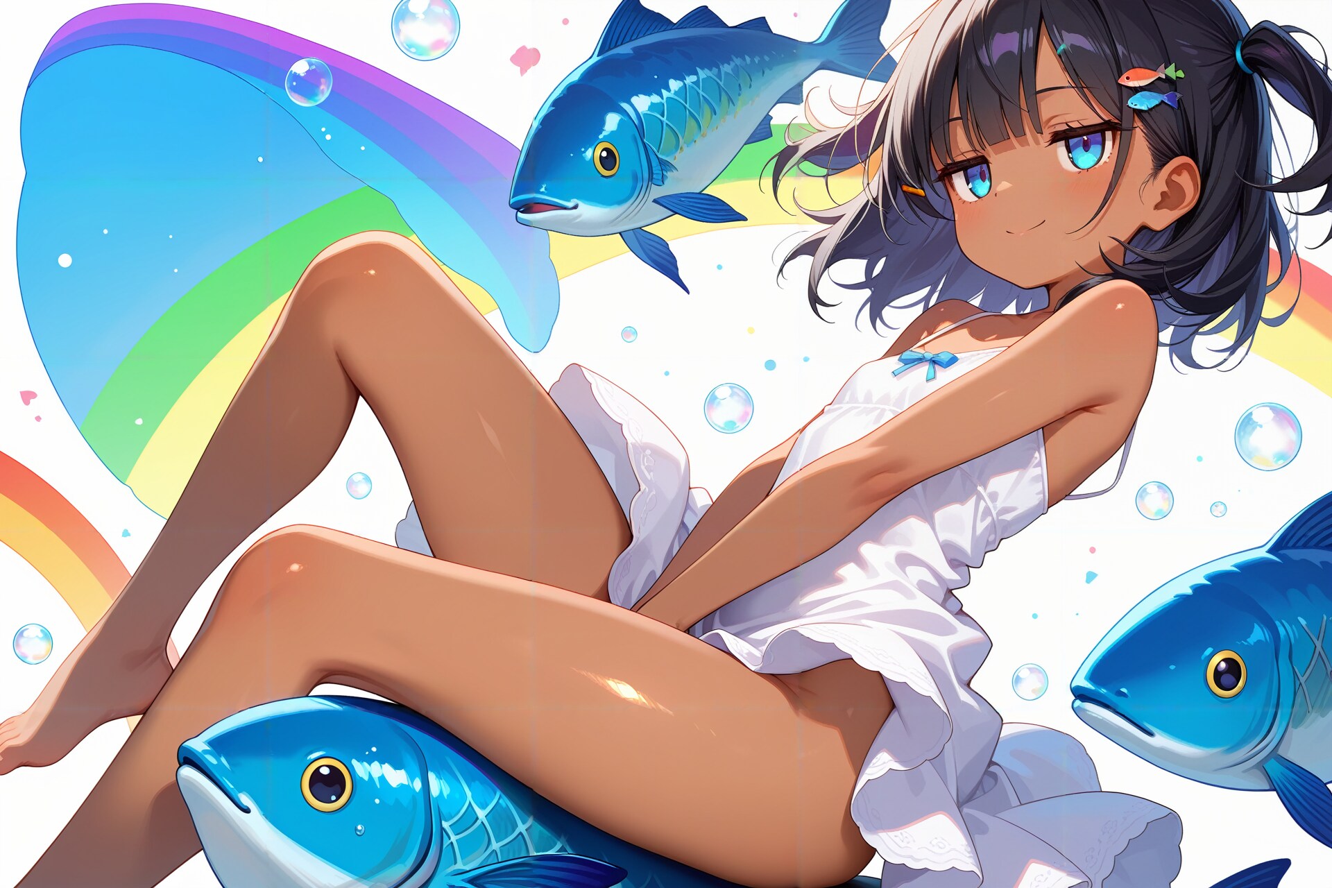 褐色少女にはカラフルな背景が映えるだろうと、虹に。あとはガチャして良さげなものを。