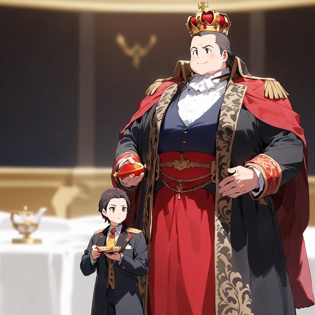 40代後半で少し太っていて白髪まじりの黒髪の男性は国王である。彼は豪華な金糸で縁取られた深紅のマントを羽織り、紋章が刻まれた重厚な金色の王冠を被っています。彼は白髪まじりの黒髪を際立たせるダークカラーの上着を着ており、体型を考慮した広めのシルエットのチュニックを付けており、正装にふさわしい装飾が施された黒のブーツを履いている。背景はお城の中の王の間である。※衣装はCopilotの提案を受けました。