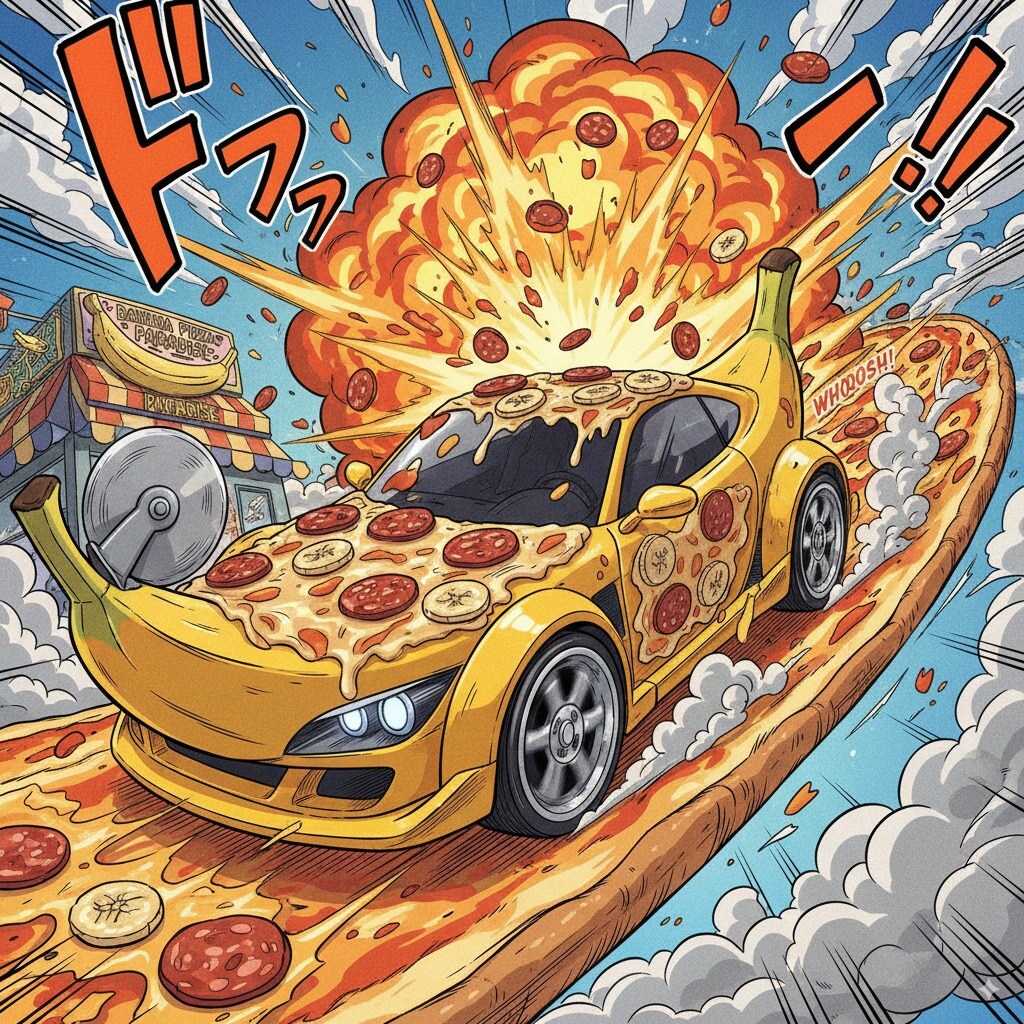今、話題のNanobananaを使ってみました。バナナが怪異ピザカーと組合わさったことで、バナナカーなのか怪異ピザカーなのかのバトルが始まっています。