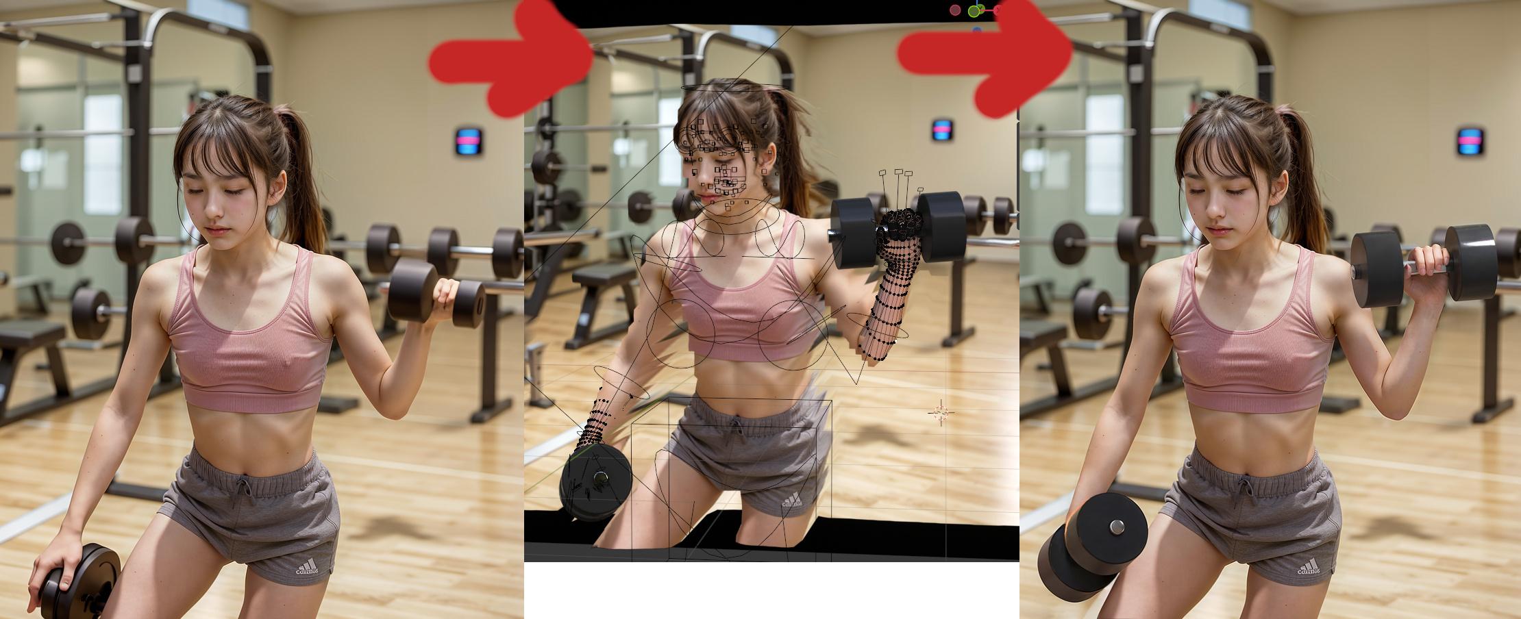 単純にimg2imgで修正する場合は立体的な制御が難しいですが、3D上で合成する事により、より複雑な修正が可能になります。