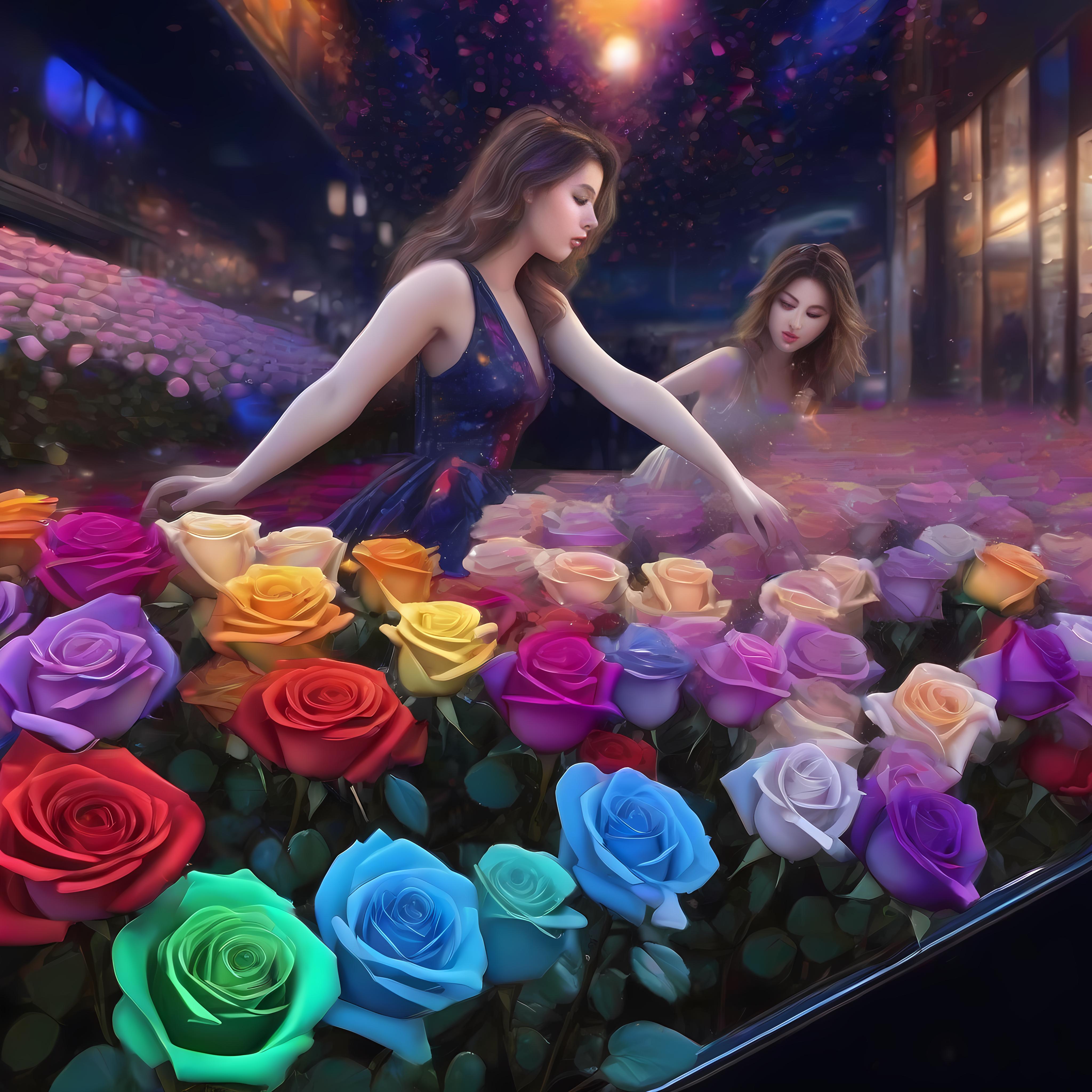 行っています。床に彩られたカラフルなバラが一瞬