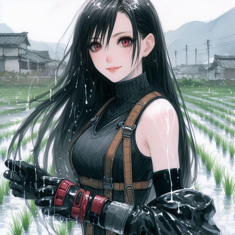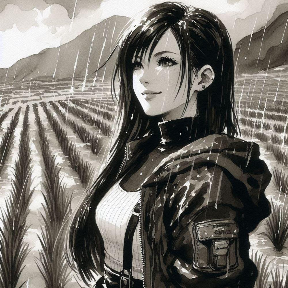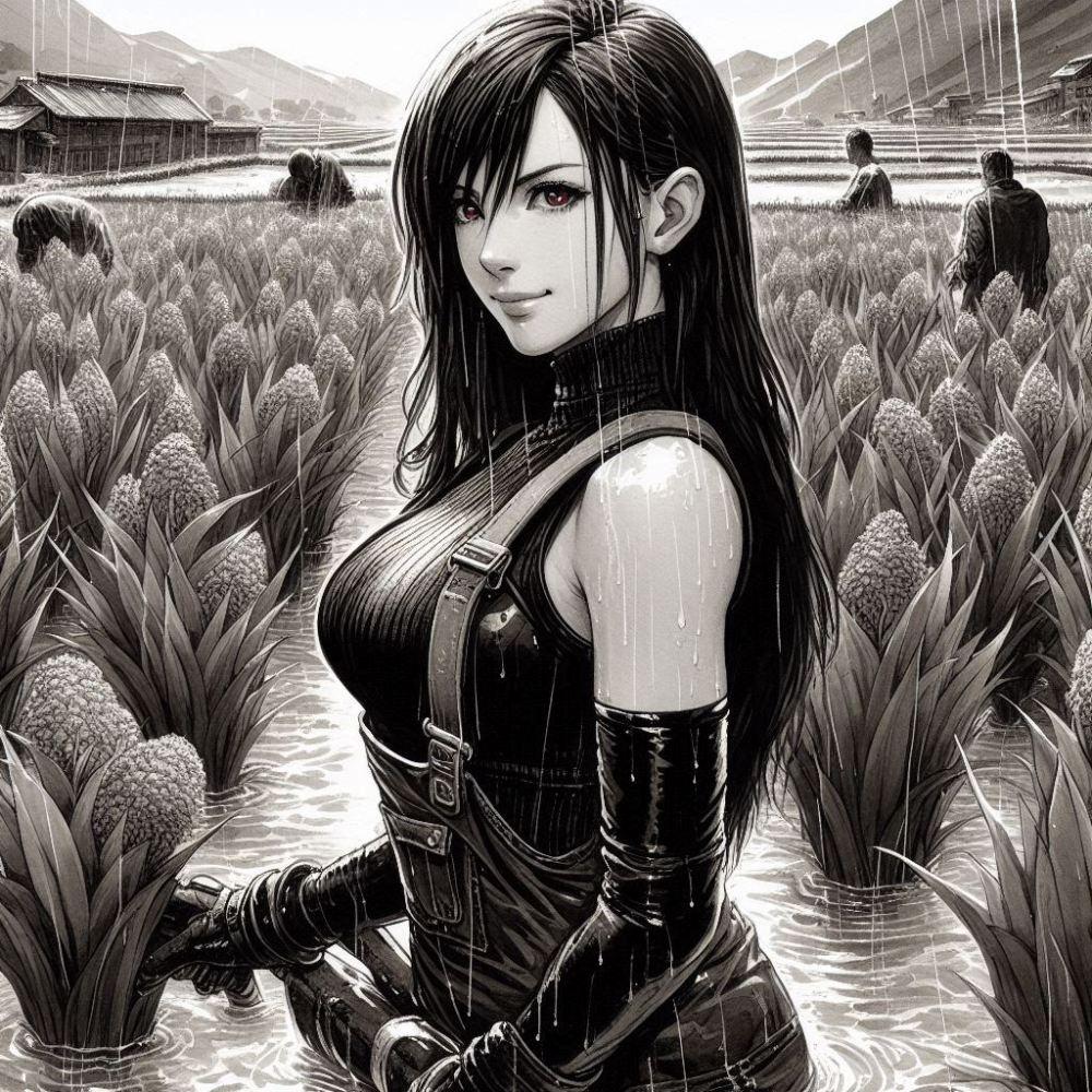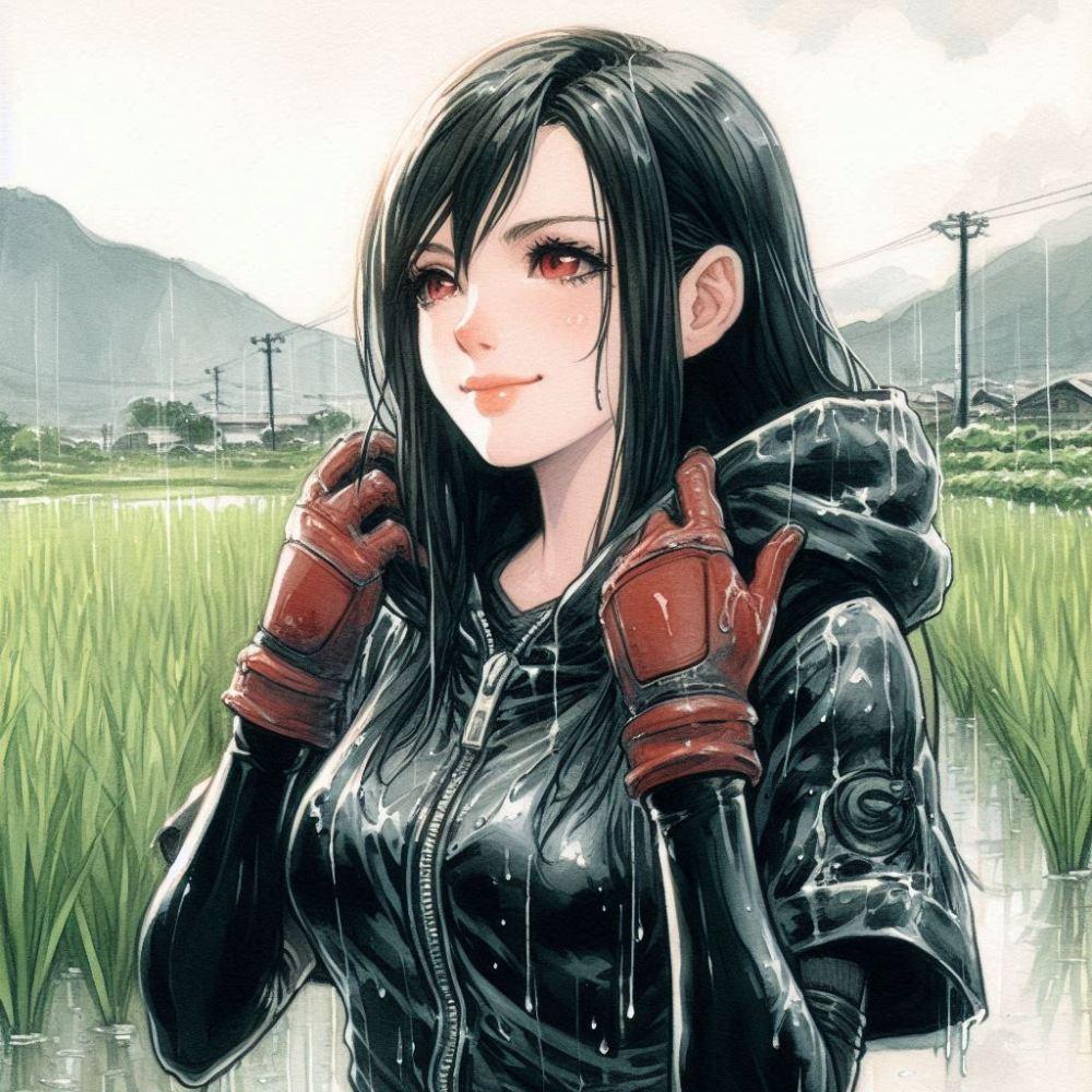 水墨画水彩アニメ風梅雨に田植えするレインコートボディスーツコスプレ人妻