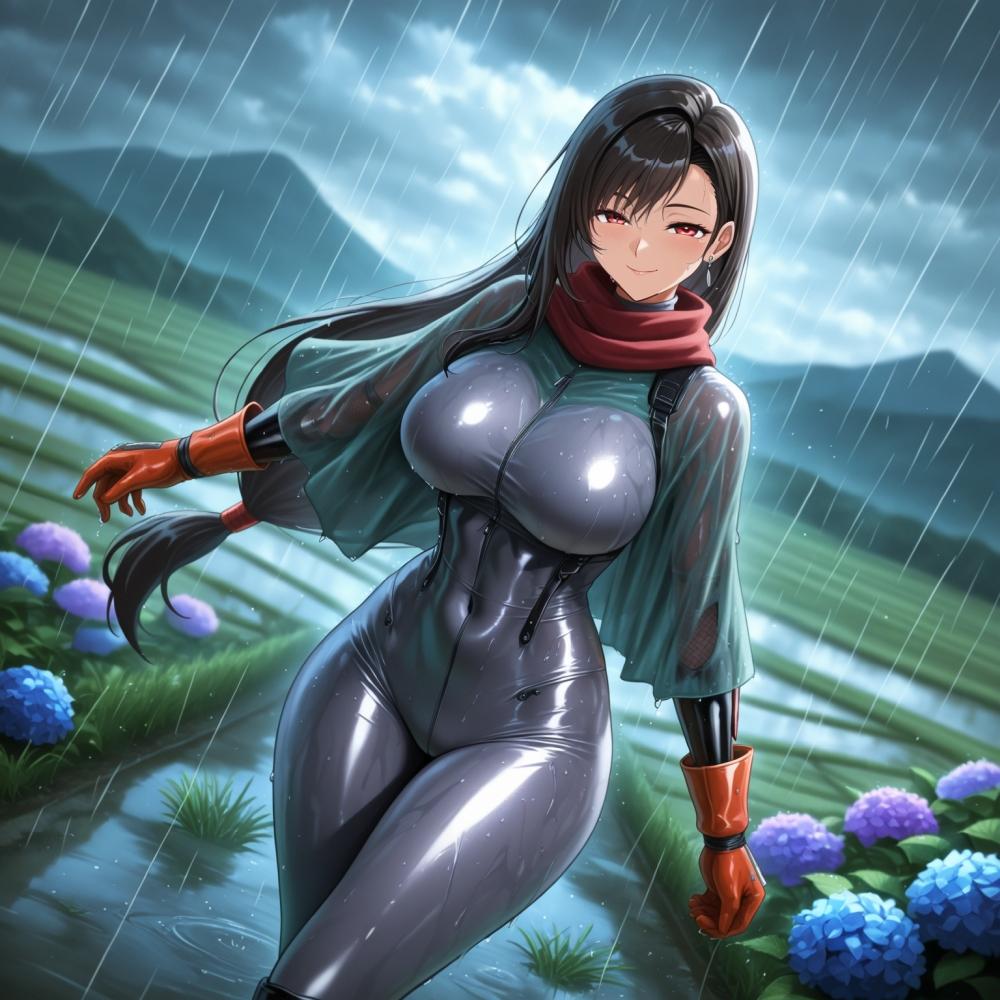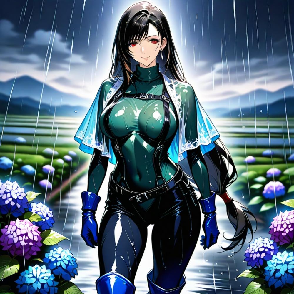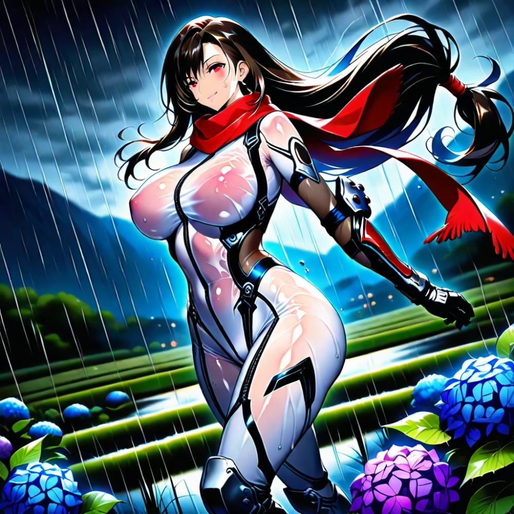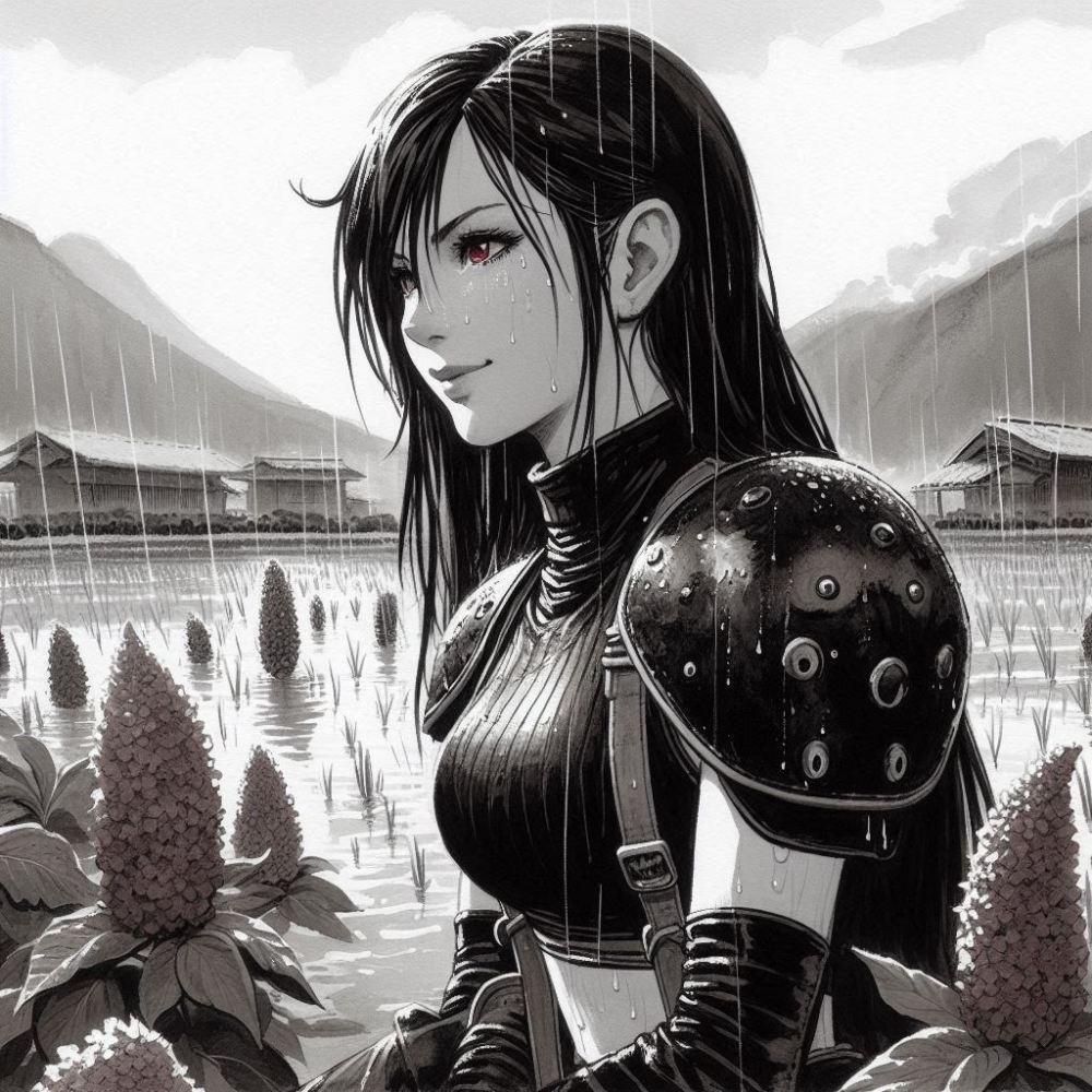 水墨画水彩アニメ風梅雨に田植えするレインコートボディスーツコスプレ人妻