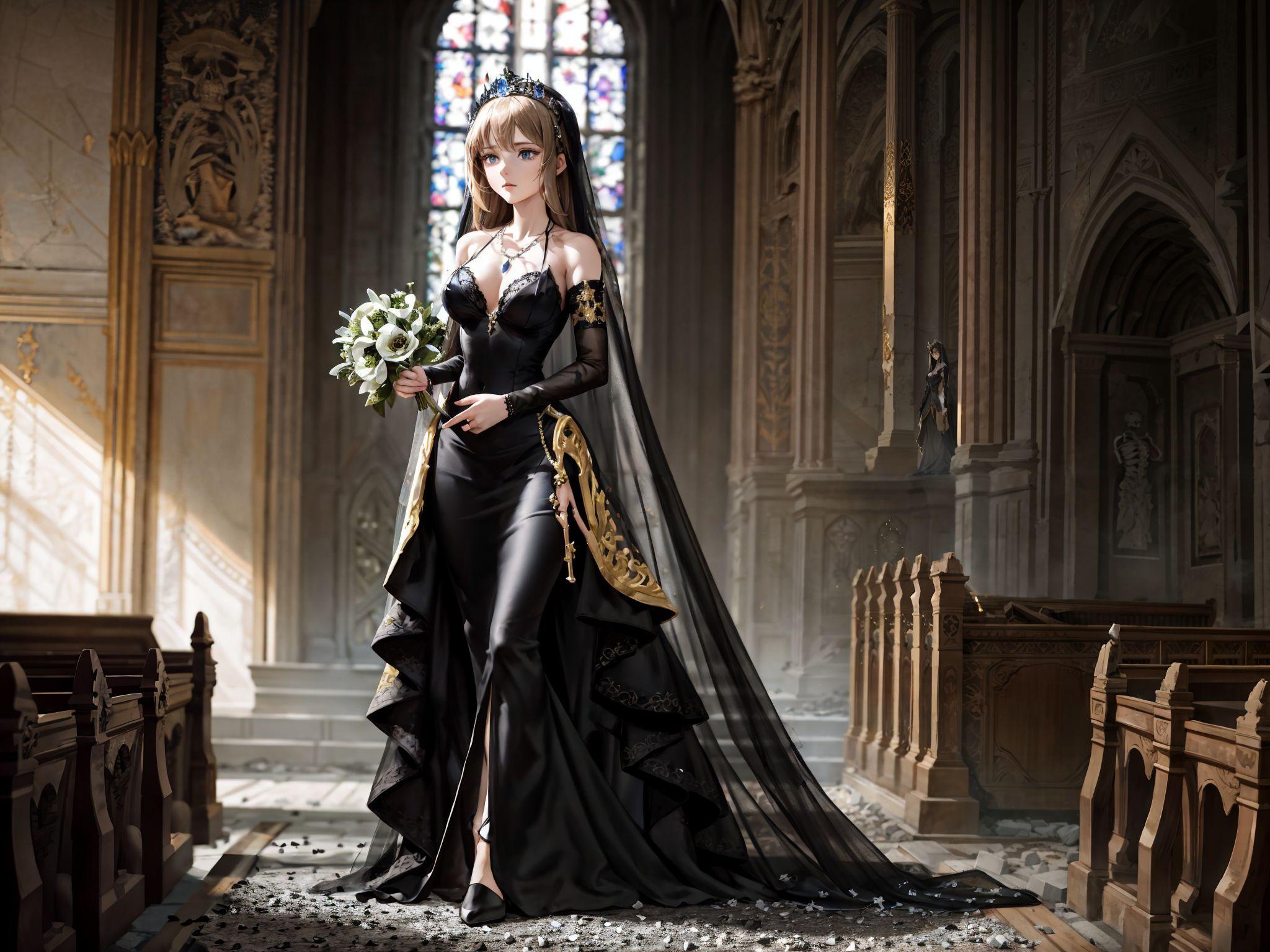 かつては荘厳だったであろう礼拝堂の廃墟。一人の花嫁が黒百合のブーケを手に、瓦礫の散らばるバージンロードを祭壇に向かって歩いている。