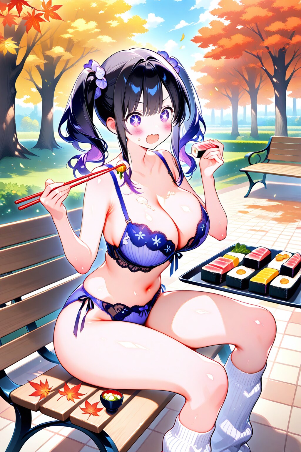 公園で寿司を食べる藤俵瑛子(下着姿)