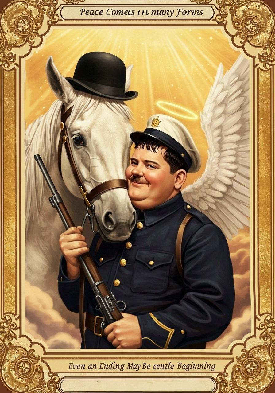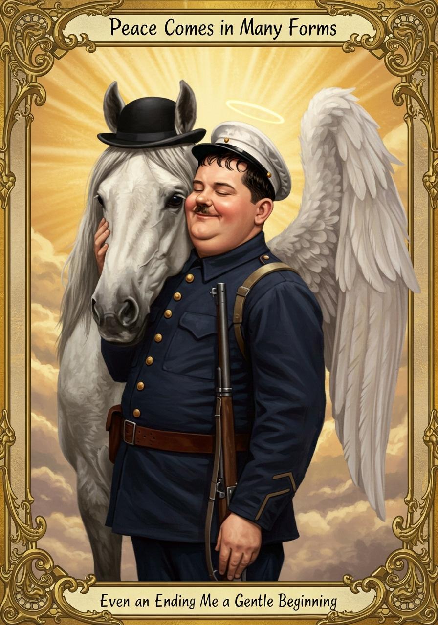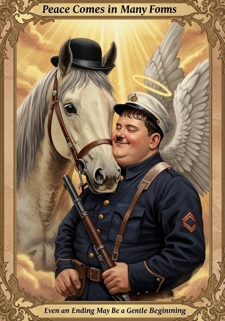 ローレル&ハーディの代表作『天国二人道中』の、あのシュールなラストシーンのイメージです(戦死した兵士と相棒の軍馬…ではありません)。