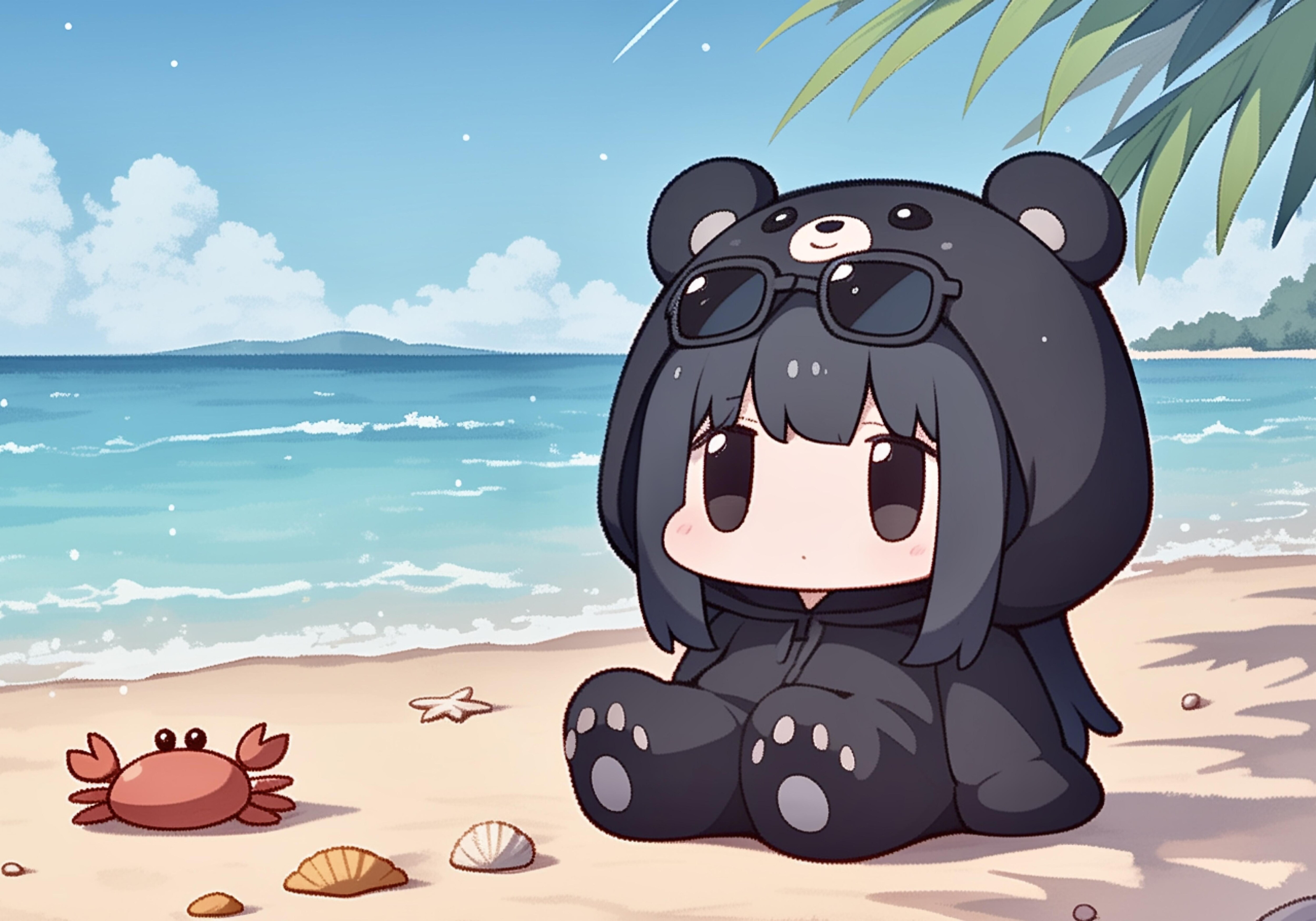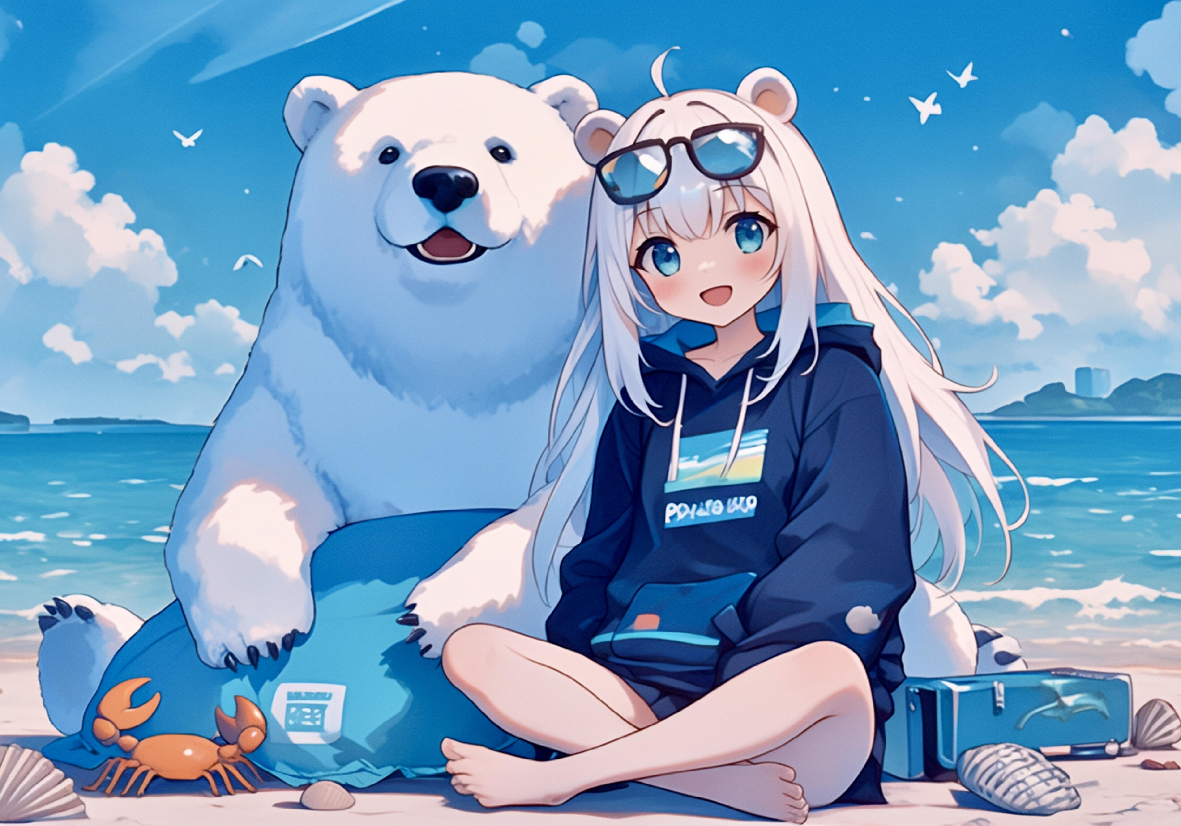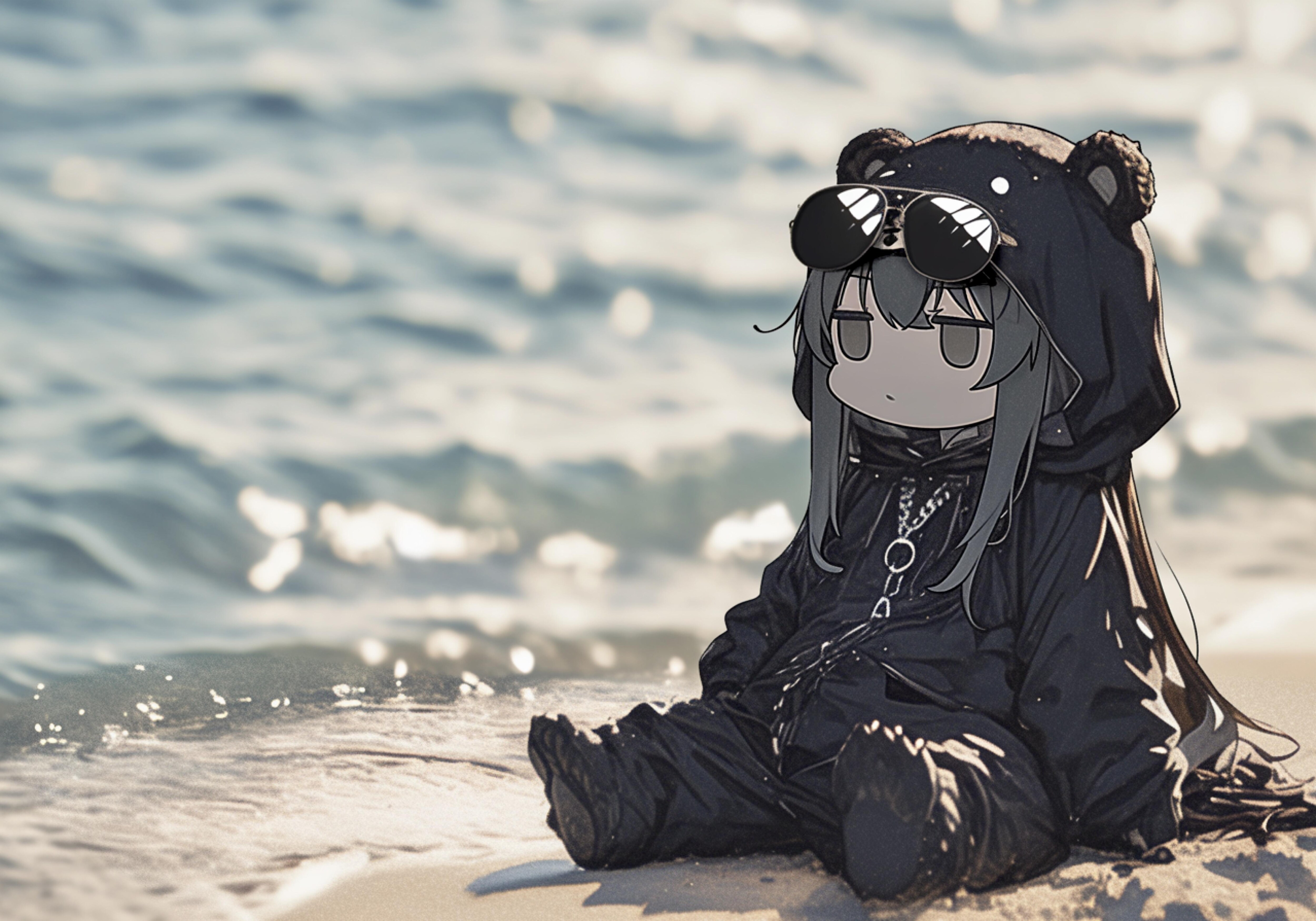 くま娘は、ビーチに着いたものの、厚手のパーカーを着たままで暑そうにしていた。くま耳はしおれて、汗が額ににじむ。