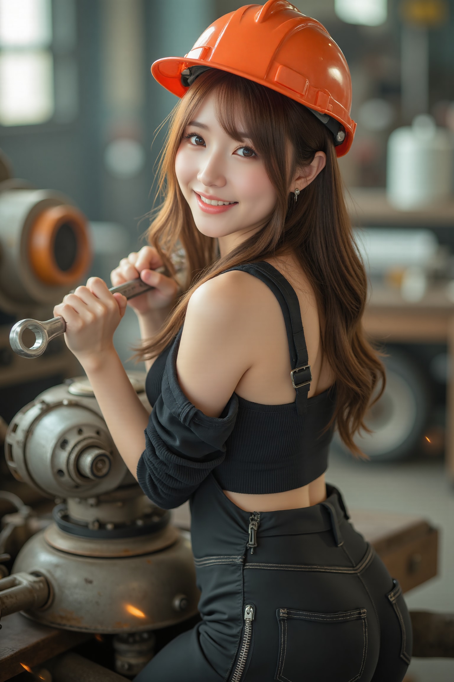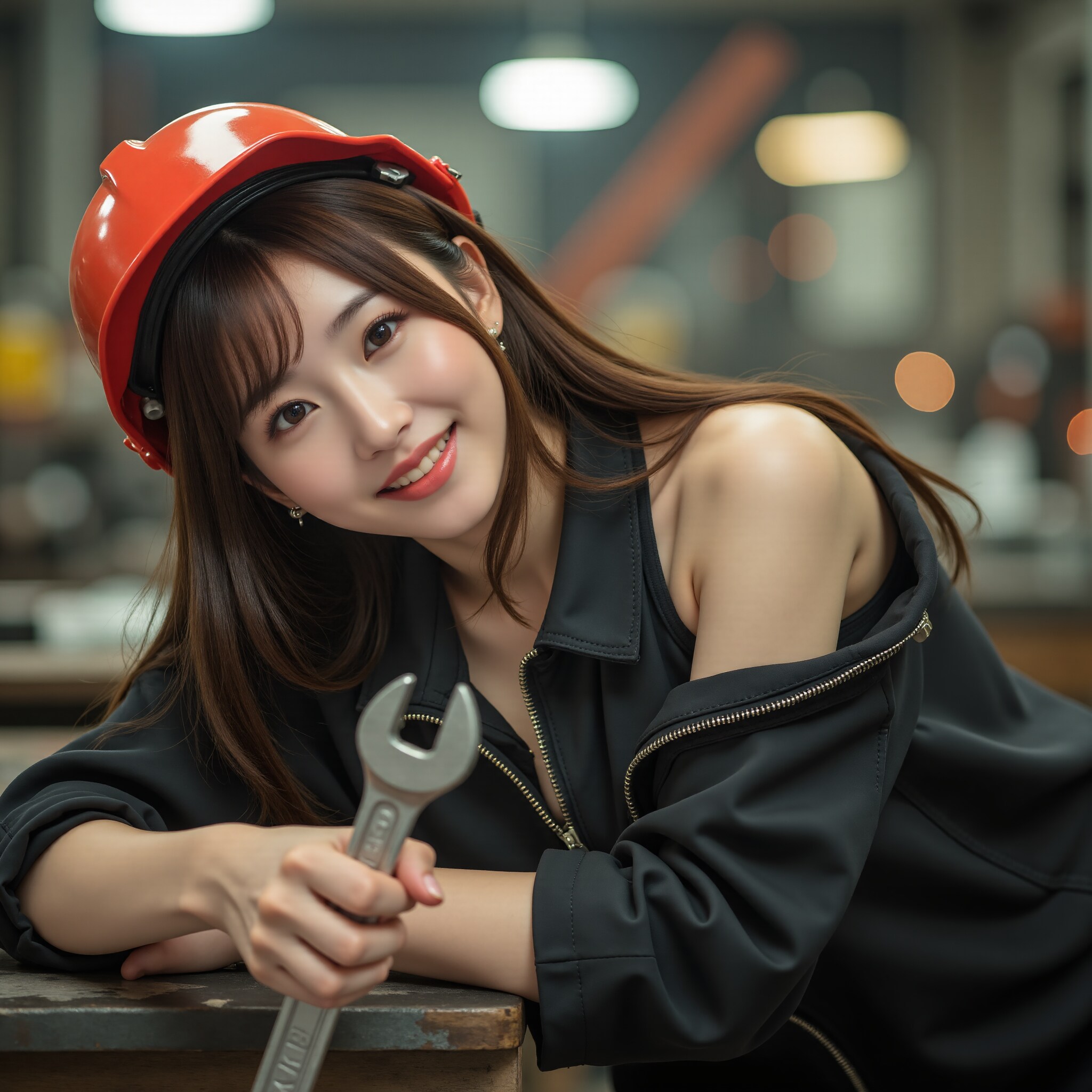 工場にて撮影!レンチを持てば、作業できそうでしょ✌️似合ってるかな〜😄