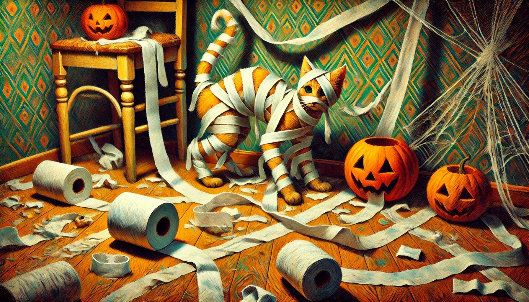 ミイラの衣装なんていらない、トイレットペーパーさえあれば十分!好奇心旺盛な猫がハロウィンを大騒ぎに、かぼちゃのランタンと一緒に巻き込まれている。