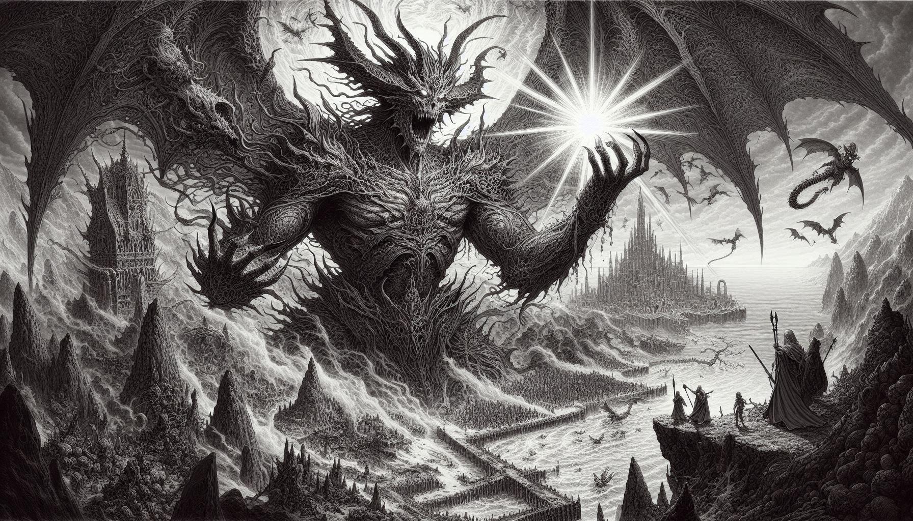 内容的には、企画ページを見た時、世界観の解説に”長きに渡る戦争は、魔王の死をもって終結し”の一文があったので、魔王が死ぬことになった”最後の戦い”をイラスト化してみました。