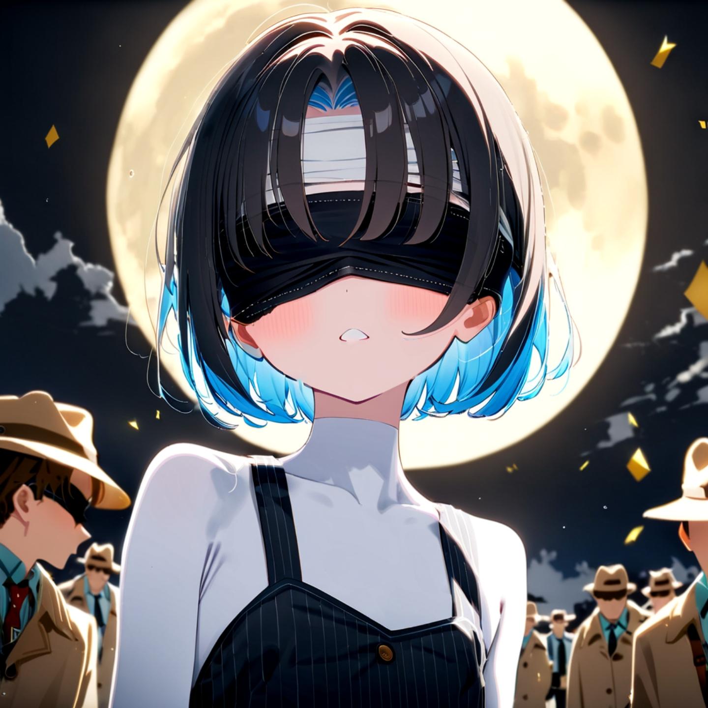 score up_9,score up_8,score up_7,source_anime,rating_safety,masterpiece, best quality,insanely detailed,super fine illustration,8k,rule of thirds,a girl,solo,20yo,(blindfold:1.5),short hair,(two-tone hair(black and white),BREAK white skin,flat chest,small,BREAK 探偵のような服装をしている,BREAK 犯人が誰なのかを考えているシーン,BREAK 背景は書斎,Fullmoon,detailed background,beautiful background,