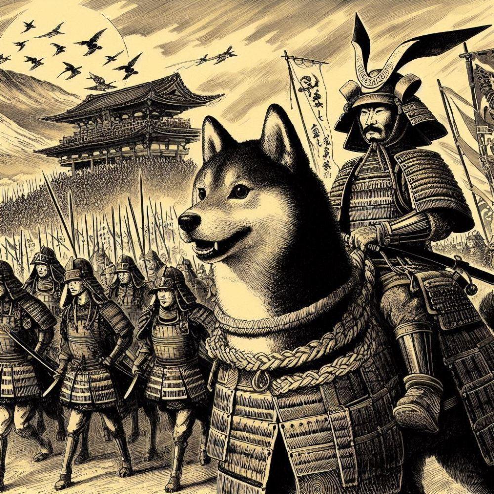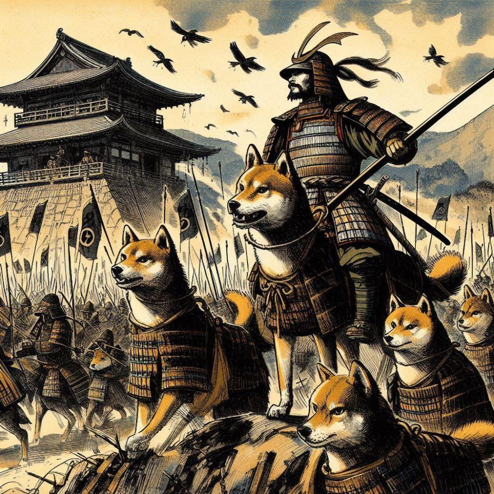 墨絵、戦国時代サムライ柴犬、関ヶ原合戦