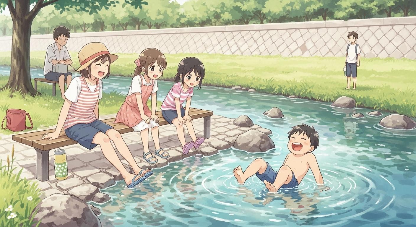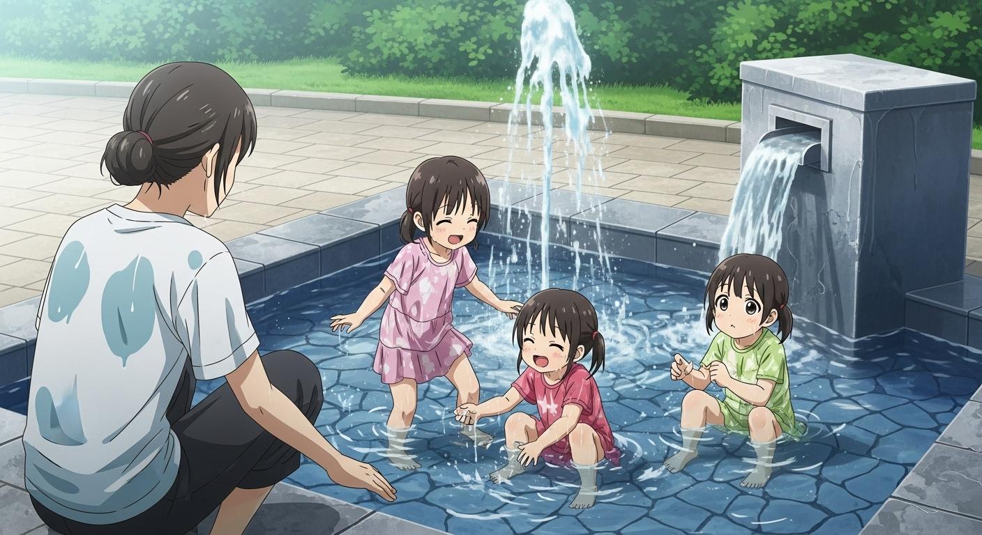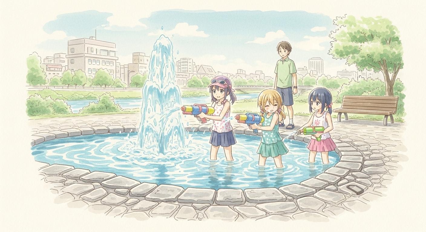 (なつの ひざしが、きらきらと ふりそそぐ、まちの こうえん。いしだたみの ちいさな みずあそびばには、ふんすいが、シュワシュワと おとを たてて、そらへと みずを ふきあげて いろあざやかな こうけいが ひろがります。)