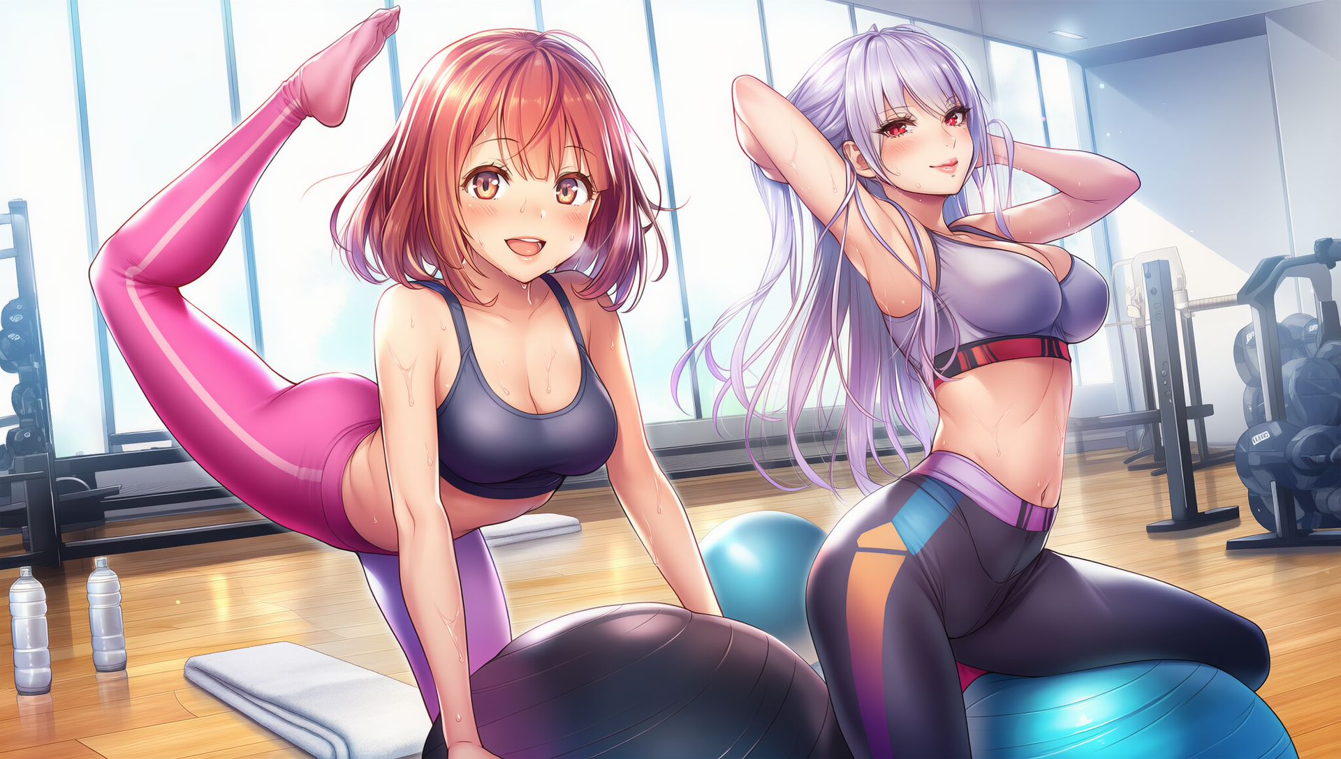 マンションのフィットネスルームで、朝日を浴びながらノノカちゃんとミレナさんがピラティスに挑戦!バランスボールで楽しくトレーニングしてるよ!✨ #オリジナル