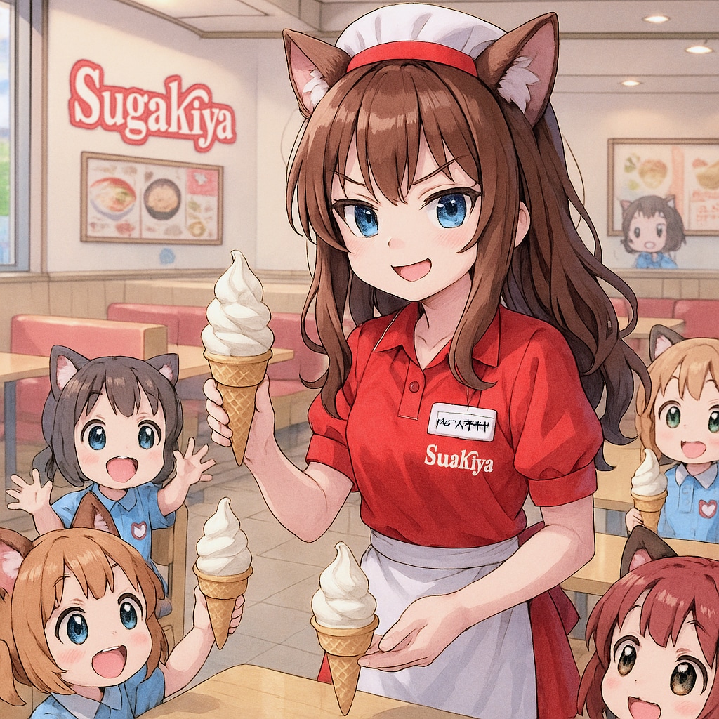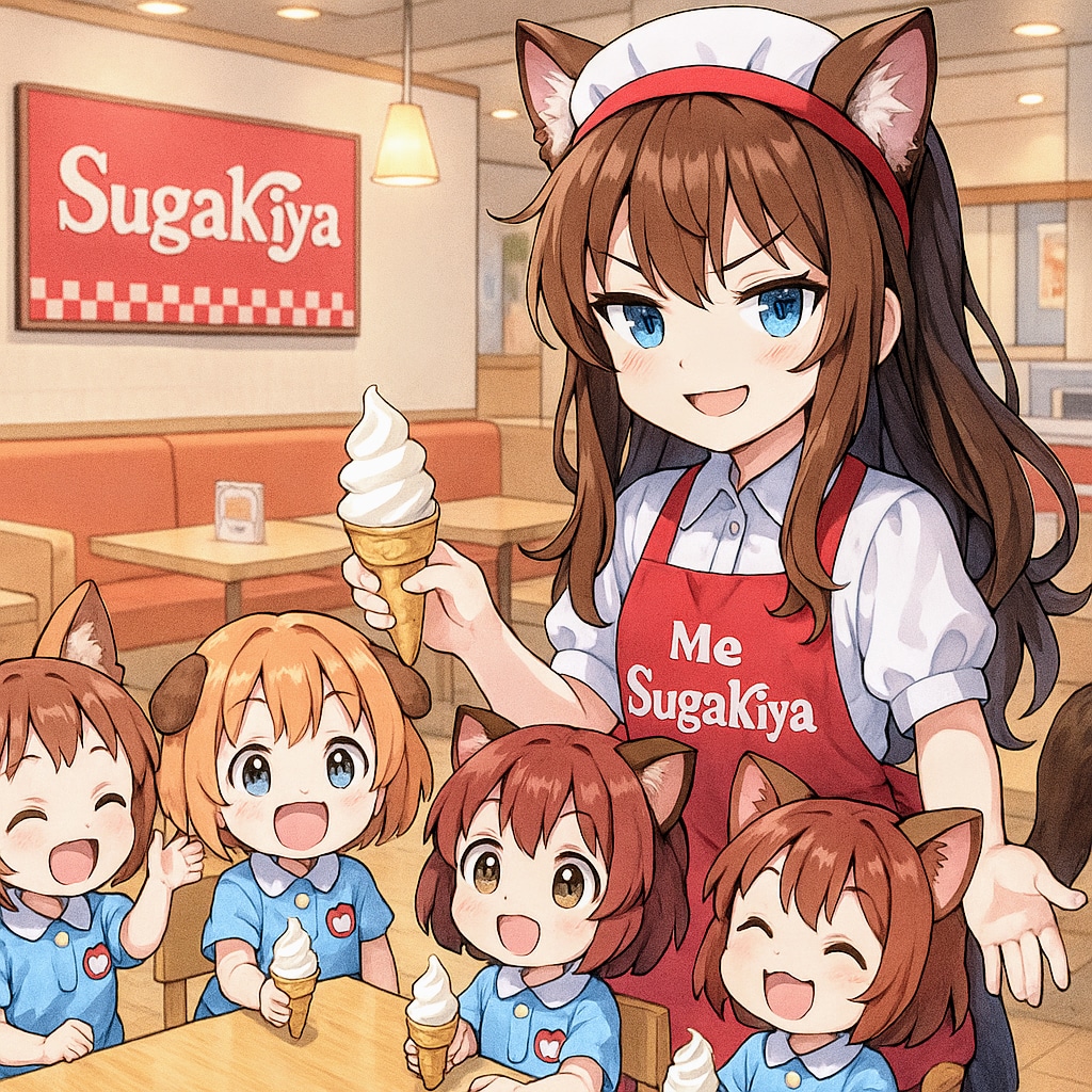 いぬみみようちえんの子たちにソフトクリームを食べさせるMeスガキ